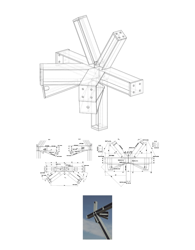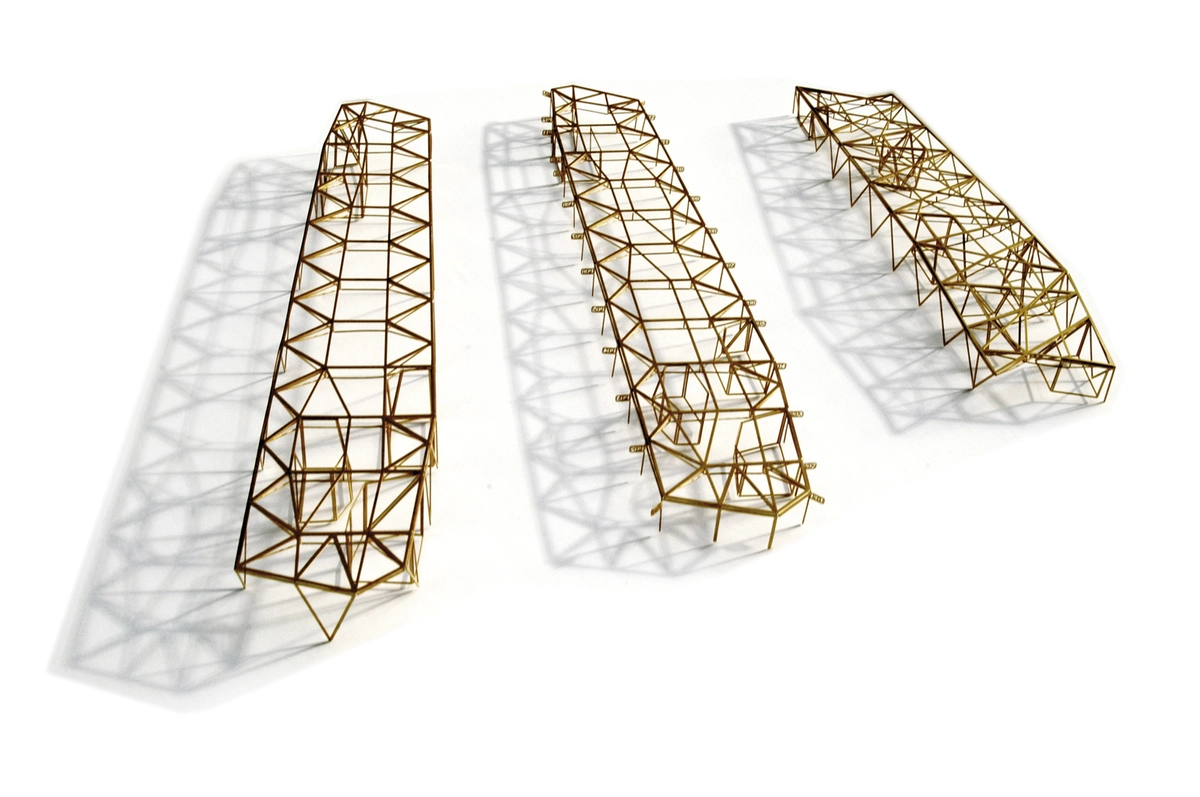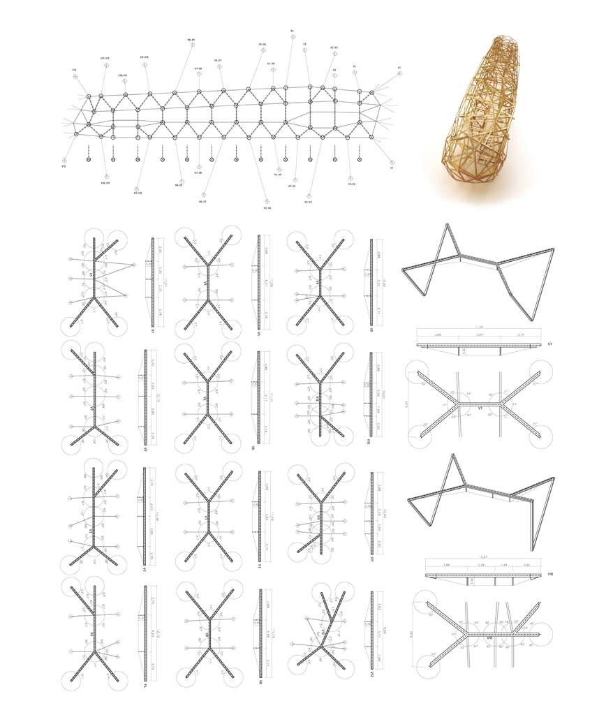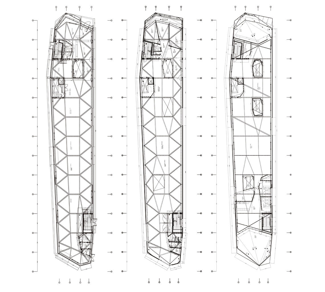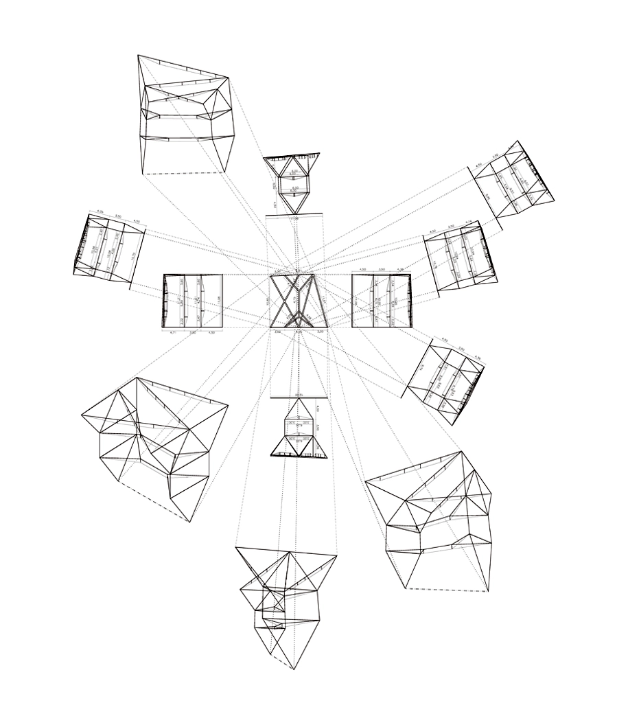 La geometría gobierna toda esta configuración del espacio, donde los patios interiores permiten la comunicación entre plantas y la entrada de abundante luz natural. El planteamiento de nudos y pórticos tipo doble Y hace posible la conexión entre tendones, barras subtensadas, vigas de borde y pilares, dejando a los patios la labor de enlace interno.