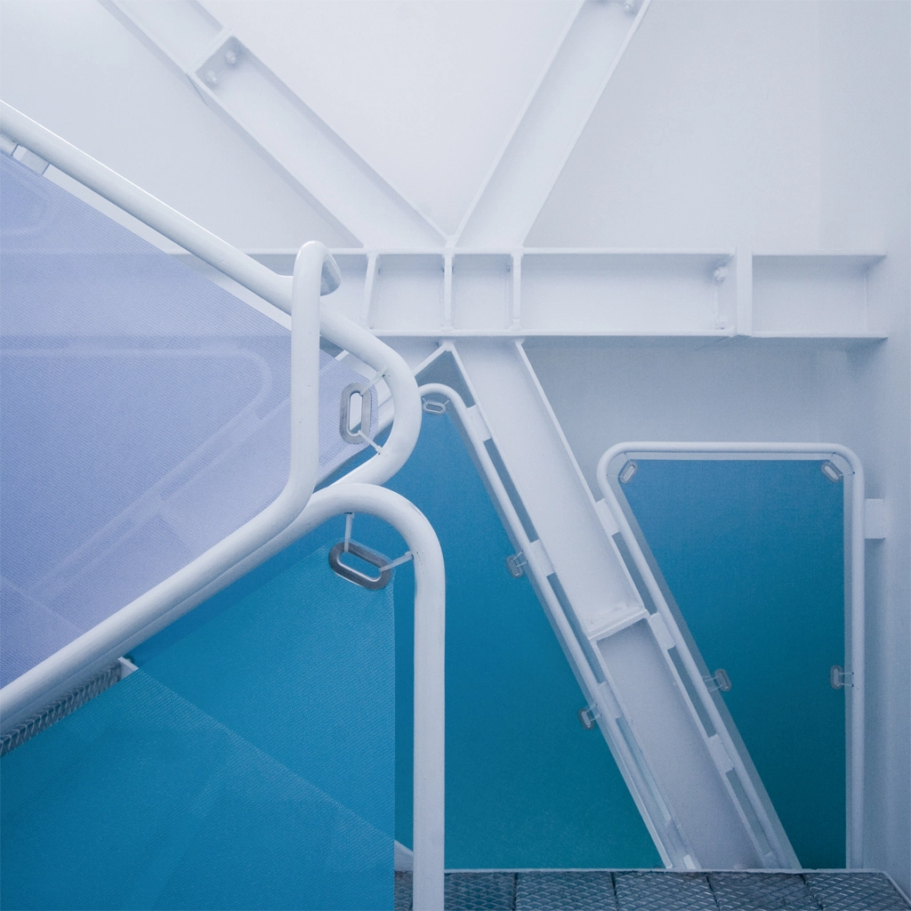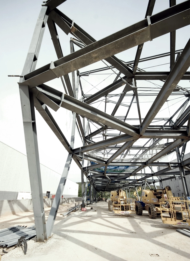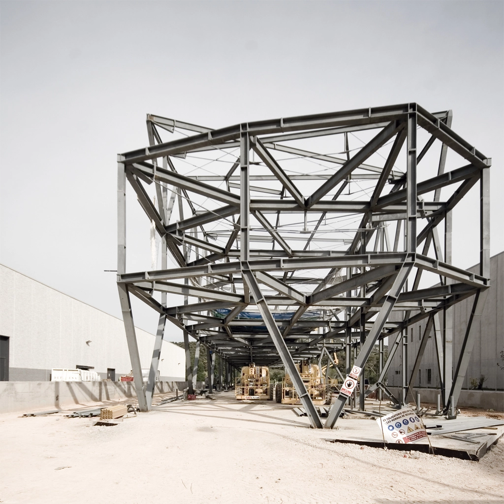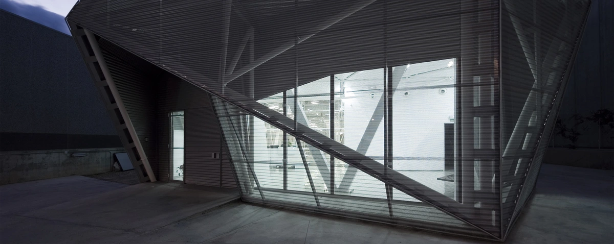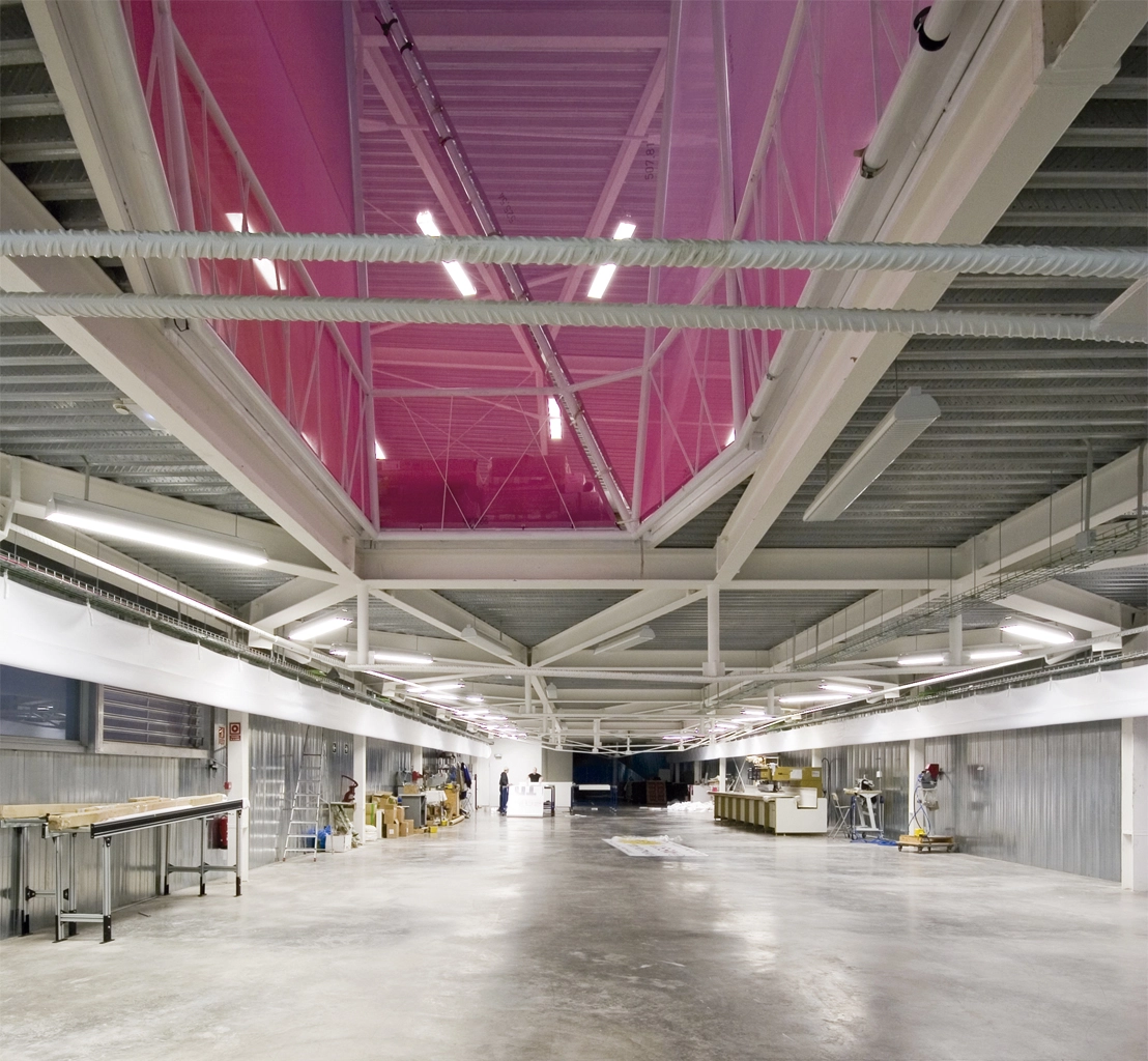 Además del cerramiento exterior, destacan otros tres elementos. Por un lado, un sistema portante ligado a la geometría y la tensión. Por otro, toda la maquinaria y los conductos de regulación climática interior. Y, por último, el área de exposición de los productos acabados, que permite desplegar sin problemas las impresiones de gran formato realizadas sobre lonas, vinilos o soportes rígidos.