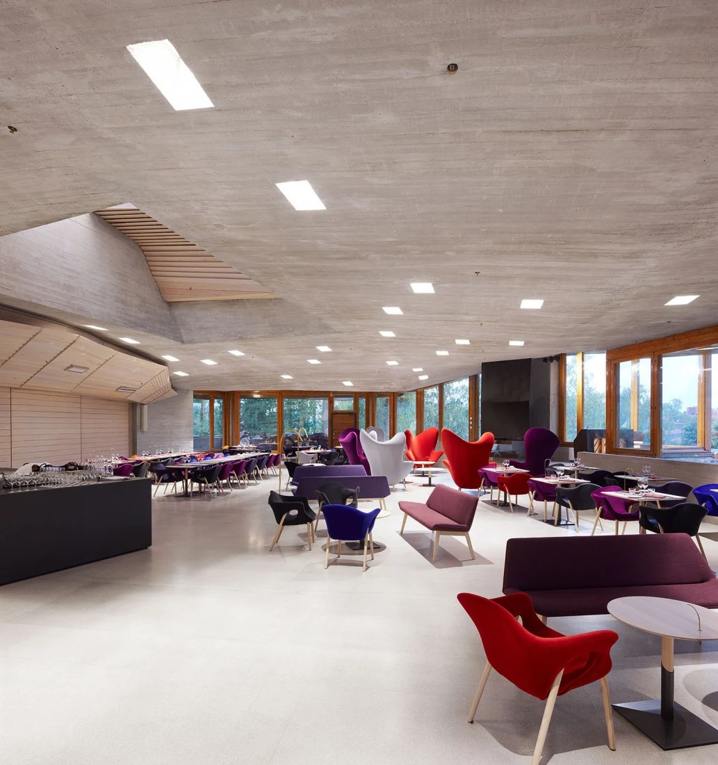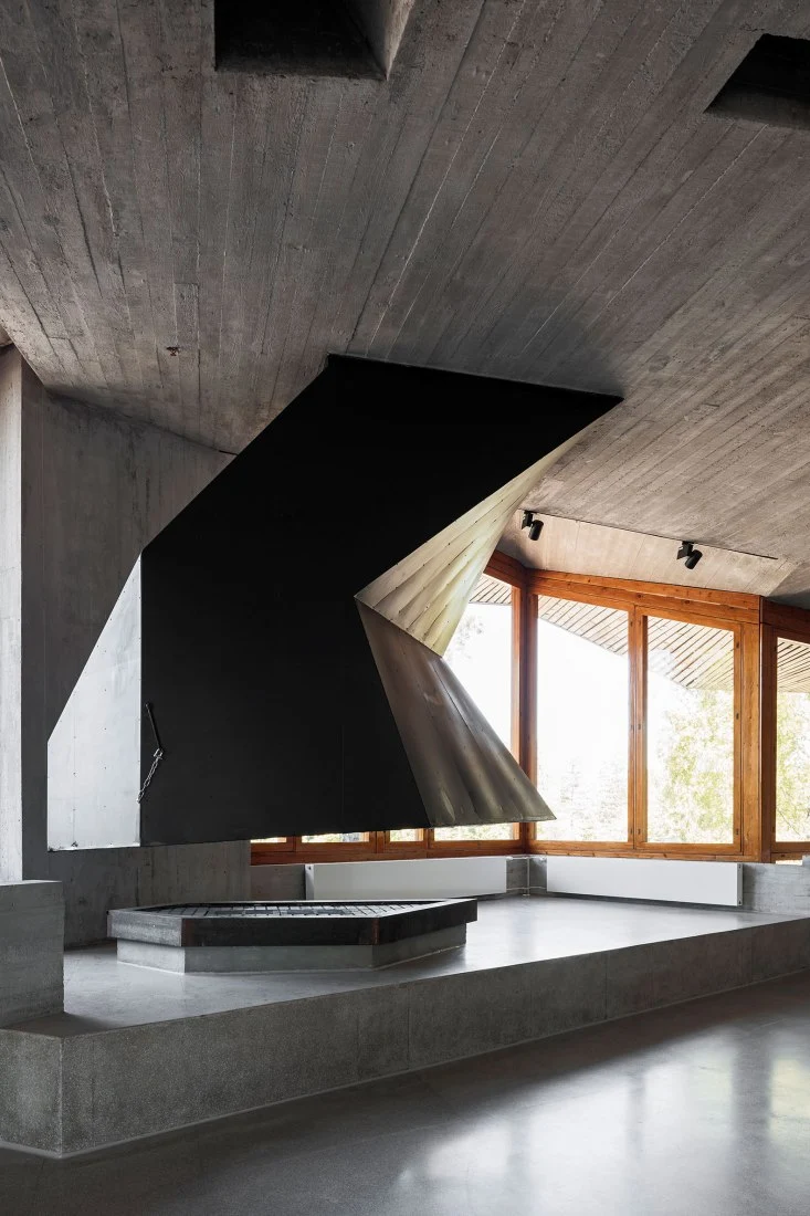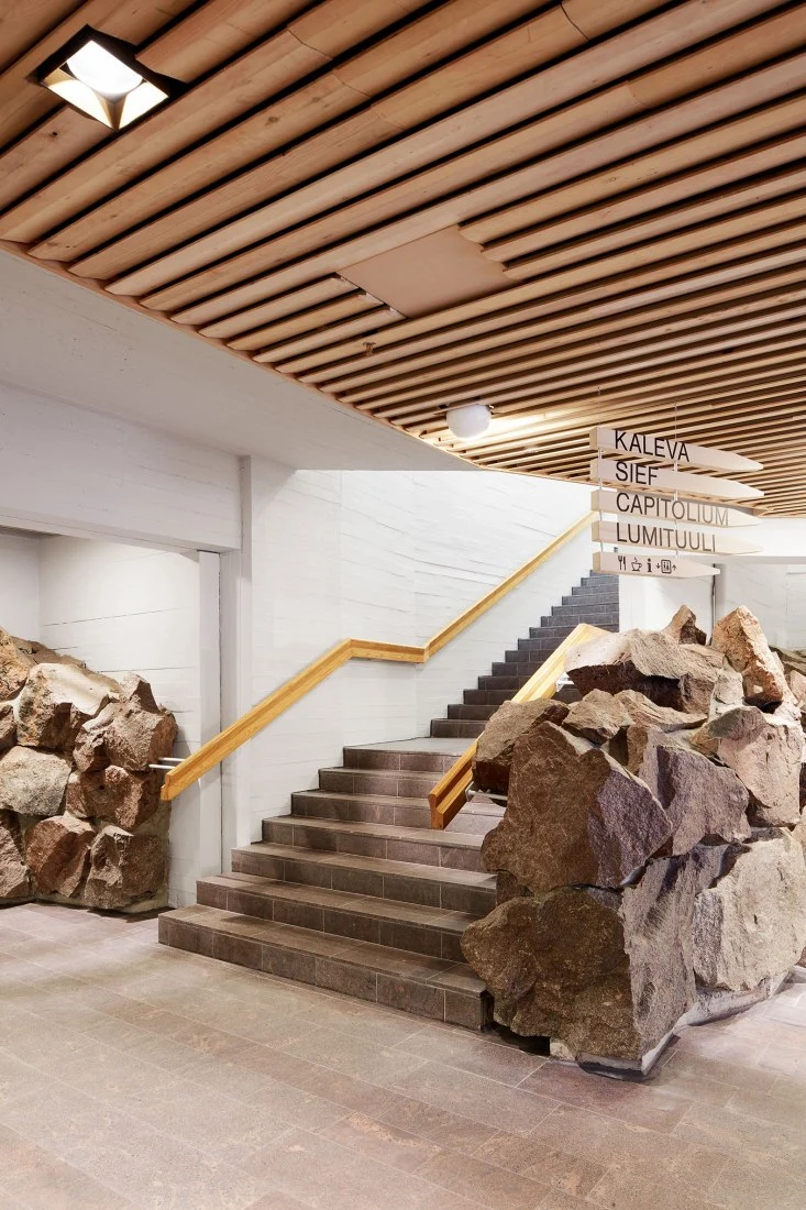 La segunda reforma de esta obra de 11 000 m2 ha corrido a cargo del estudio local ALA Architects, que reorganizó por completo el interior de este icono del diseño finlandés. Situado sobre una colina repleta de árboles, Dipoli parece brotar de las rocas, mimetizándose con el entorno gracias al uso de materiales como el pino finlandés, el cobre o las piedras extraídas de la propia colina que revisten el esqueleto de hormigón.