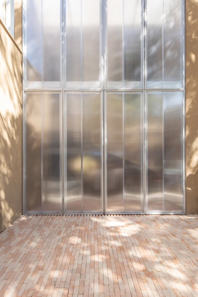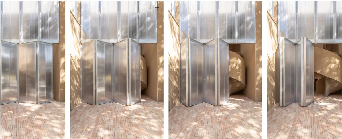 La tienda recibe al visitante con una fachada translúcida y plegable de policarbonato que contrasta con el resto de materiales. Los paneles pueden girar y desplazarse para proporcionar distintos patrones de sombra según el momento del día. Este método de regulación solar y de ventilación permite prescindir del aire acondicionado.