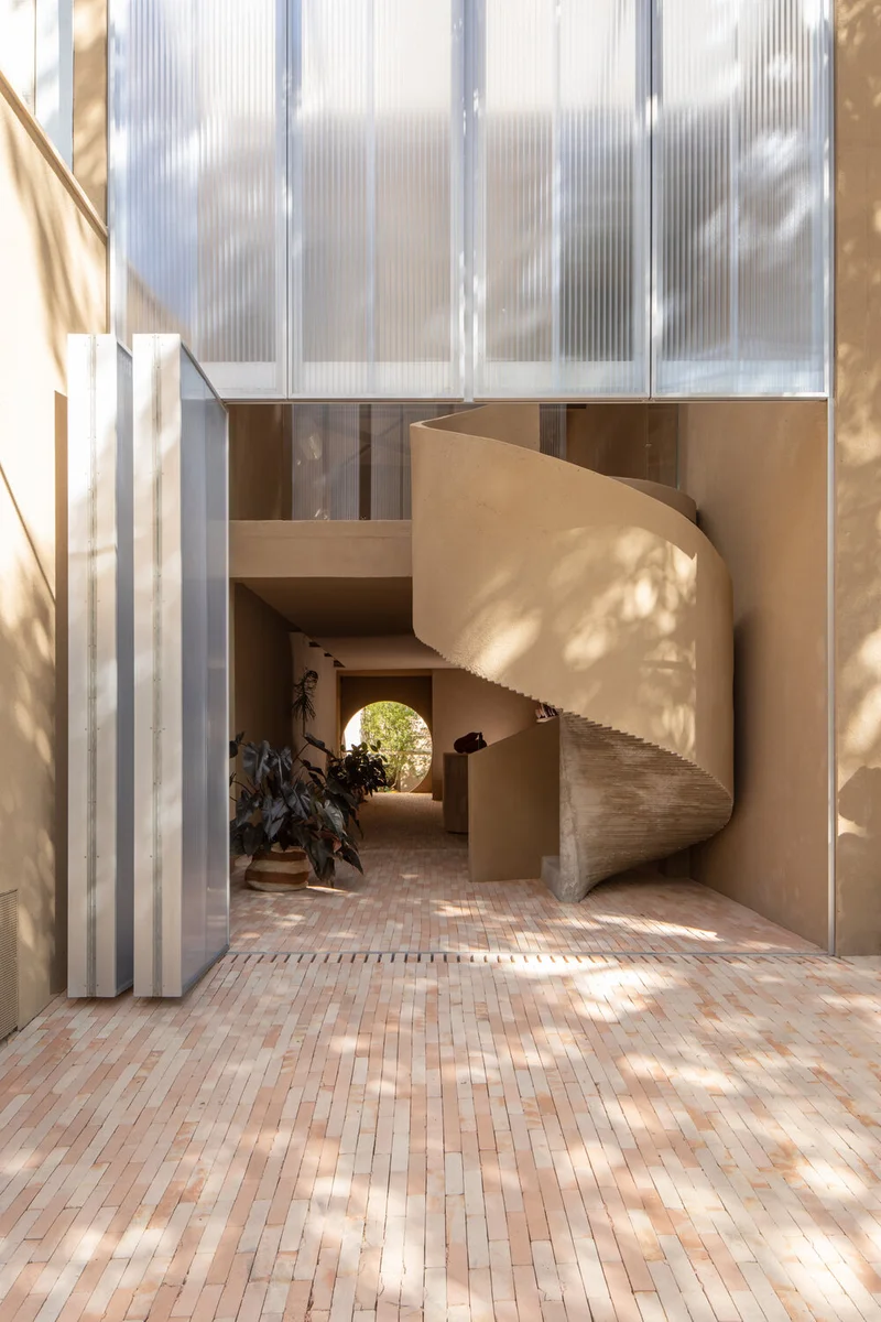 Dentro de este ambiente de paz destaca la escalera de caracol, que conecta la planta baja con la superior, dedicada a la práctica del yoga y la relajación. Su esqueleto de hormigón queda prácticamente oculto bajo el revestimiento terroso, dándole un aire de escultura al tiempo que facilita una transición suave entre pisos.