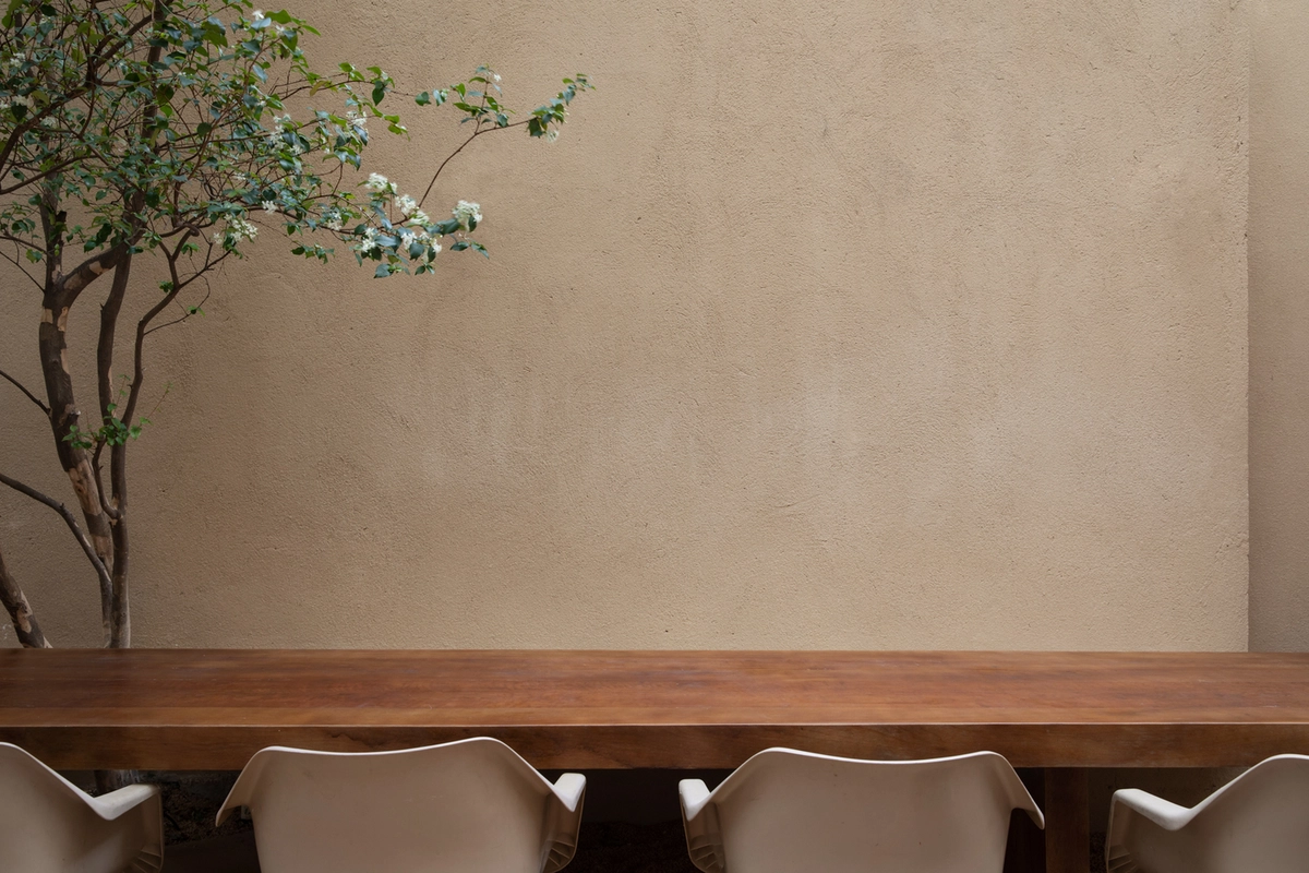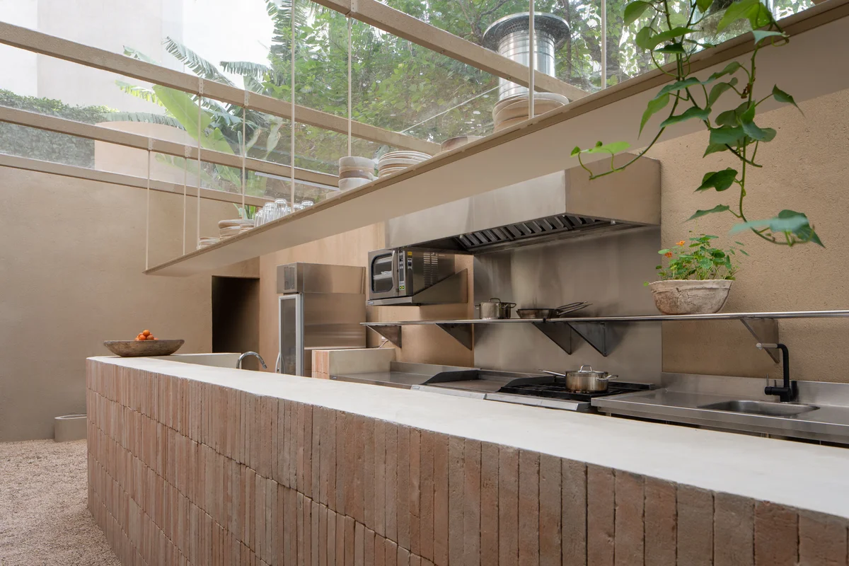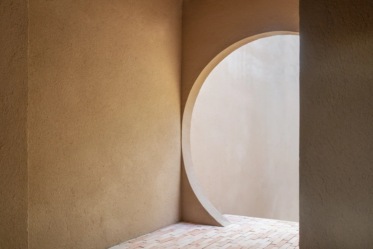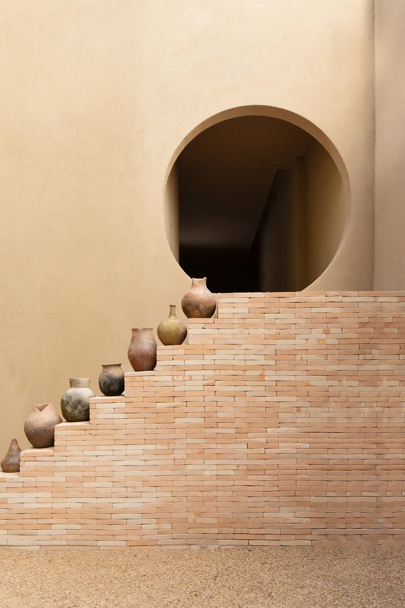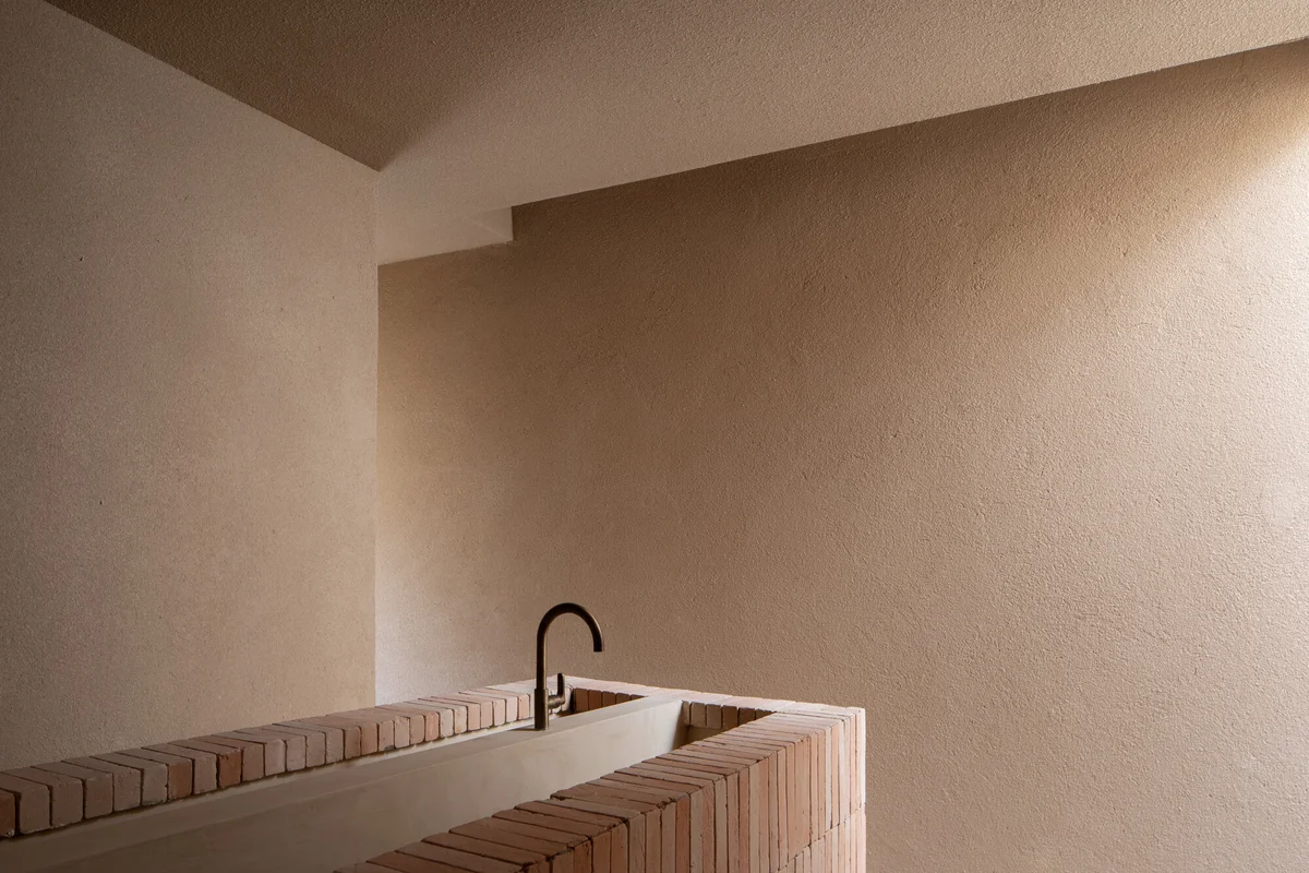 Ya en el interior, nos invade una atmósfera acogedora de colores terrosos, matizada por la iluminación natural. La terracota es la protagonista, con una gradación tonal que se expande por paredes y techos, así como en los diferentes colores de los ladrillos artesanales que conforman el suelo y parte del mobiliario. Es un regreso a las construcciones básicas, sin artificios, unidas a la tierra y con pequeñas imperfecciones a la vista.