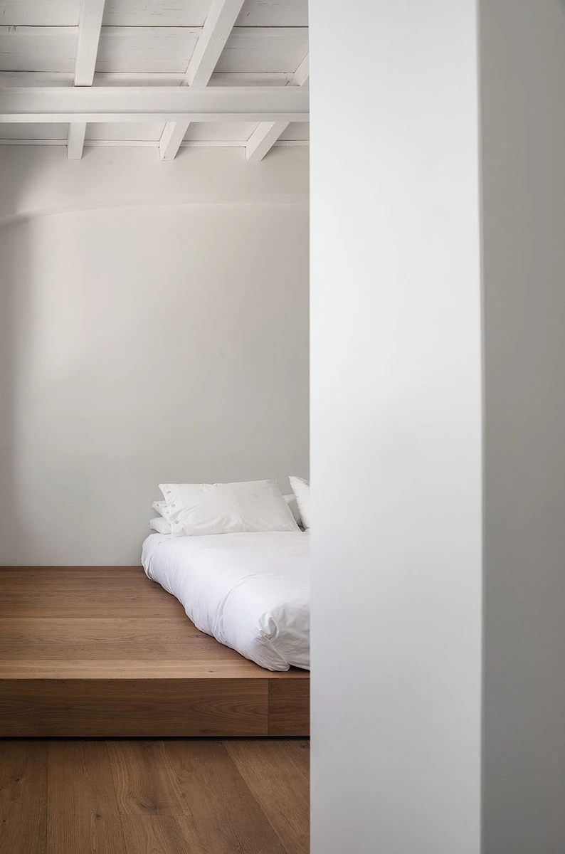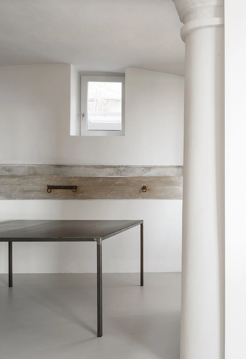 Cuenta con una planta baja en forma de cuadrado irregular y un área más reducida en el semisótano. Las paredes gruesas delimitan el espacio más o menos al azar, donde se integran a la perfección las columnas de piedra originales. La división interna se ha conseguido mediante intervenciones específicas. Así, por ejemplo, la madera se utiliza para separar la entrada y las zonas de descanso, mientras que el cristal delimita las zonas de los baños.