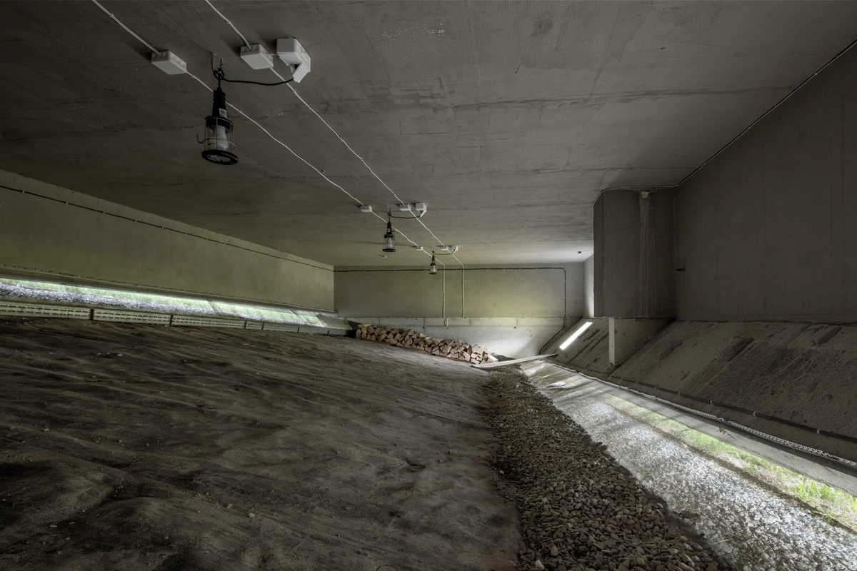 Además, esta zona montañosa de Silesia es propensa a los deslizamientos de tierras. Para proteger la vivienda, Konieczny diseñó un sistema de anclaje similar a un puente que crea la sensación de que la casa flote, permitiendo el paso libre de agua y barro bajo la misma sin dañarla. La estructura de hormigón en forma de tejado invertido se ancla así firmemente en la colina.