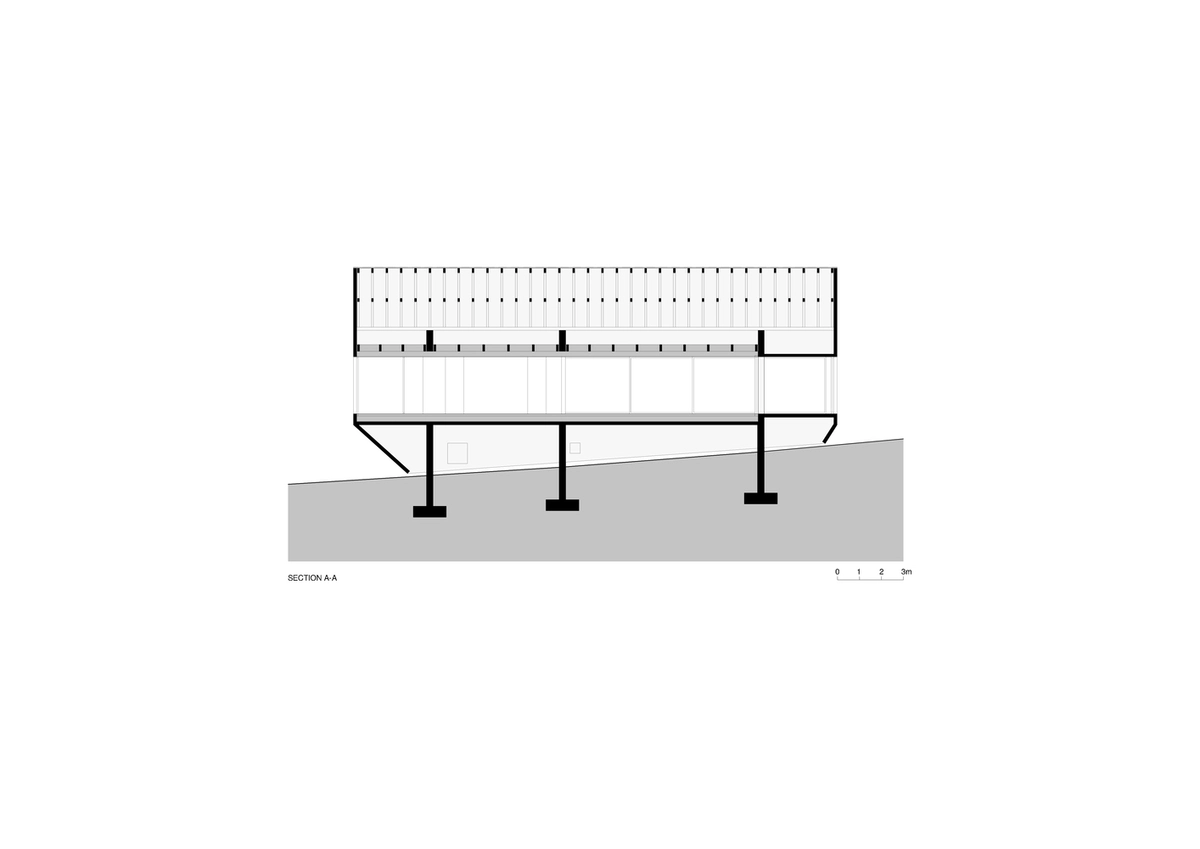 Con esta solución constructiva, parte de la planta baja pasa a convertirse en un auténtico primer piso, como la zona de los dormitorios. También cabe destacar que el lado de entrada a la vivienda se puede aislar por completo gracias a una inusual pared deslizante de 10 metros.