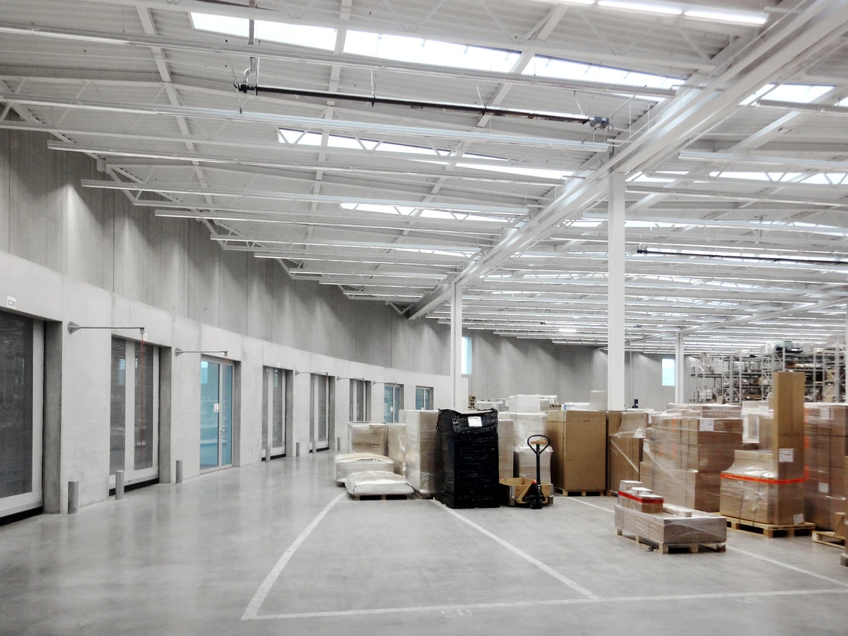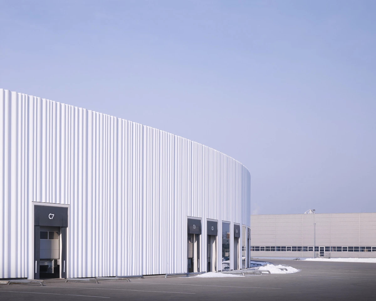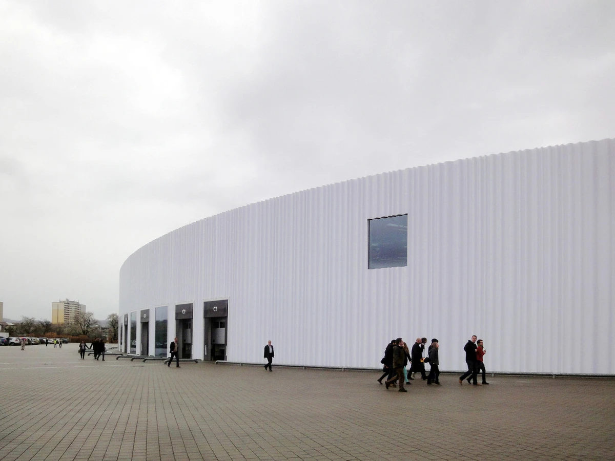 Así pues, se levantó una construcción de más de 160 metros de diámetro y 11,4 de altura, con zona de almacén al norte, área de montaje en el centro y muelles de carga en el sur, reduciendo los flujos de transporte en el interior.