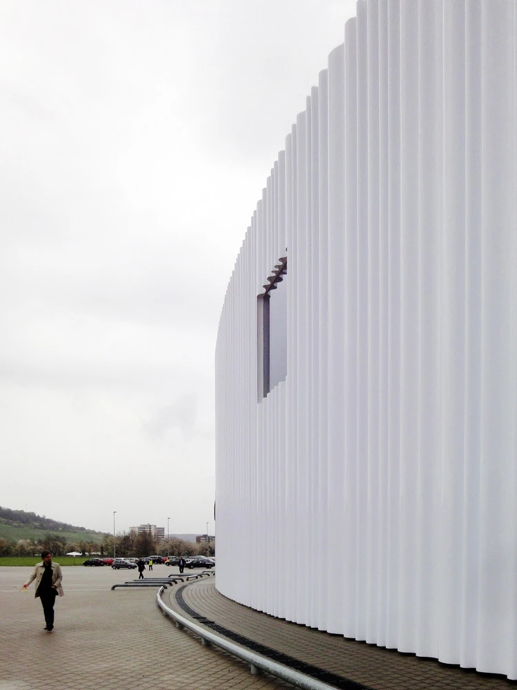 A pesar de su armadura de acero, con soportes de 9,5 metros, su componente más icónico es la fachada ondulada. Se superpone a la cara externa y rodea todo el volumen. Por expreso deseo de los arquitectos, no es un círculo perfecto, lo que recuerda un dibujo a mano alzada. Elaborada con elementos de cristal acrílico de 1,8 x 11 metros, evita la iteración monótona de las ondulaciones integrando una sucesión irregular de ondas más anchas o más estrechas.