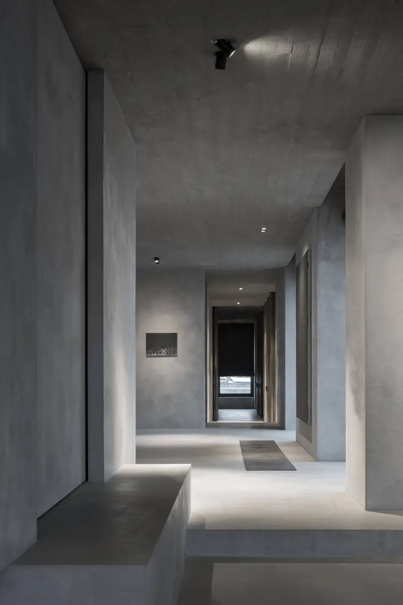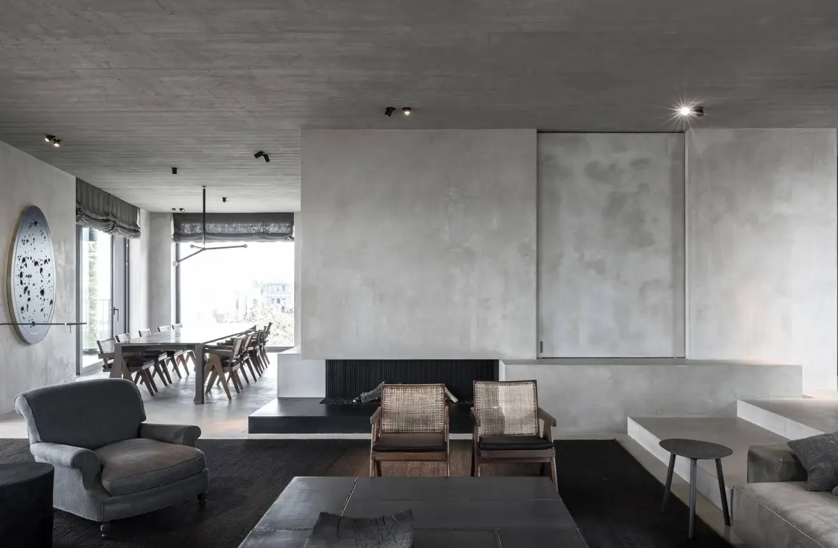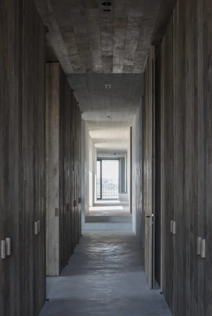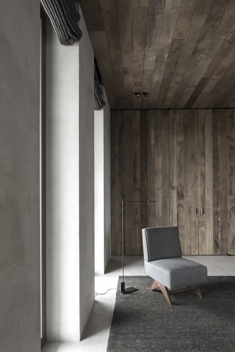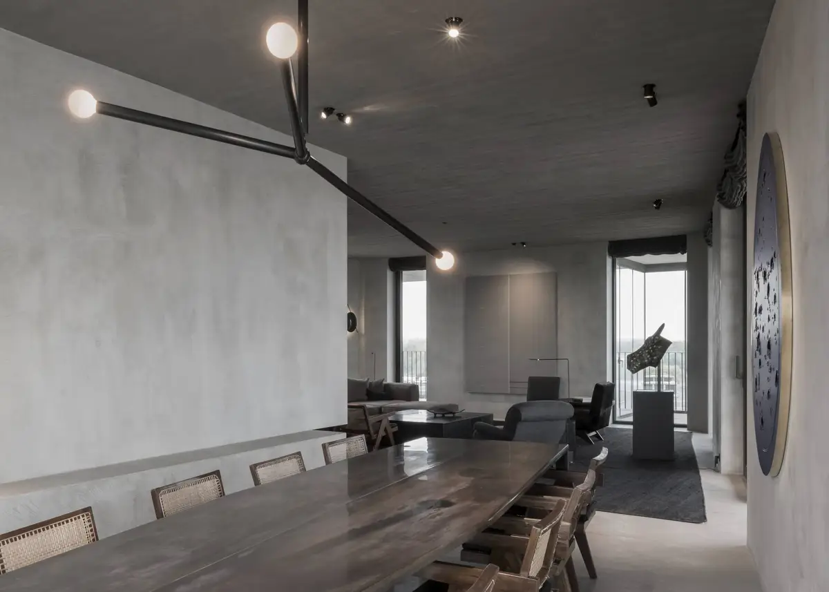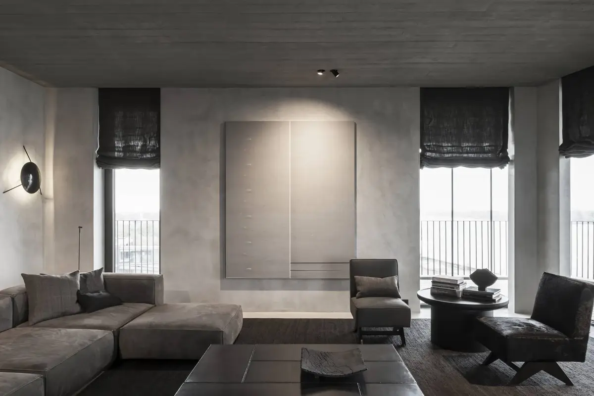 Este tratamiento escultórico del C Penthouse sirve de marco perfecto para la colección de arte expresionista del propietario de la vivienda. Como de costumbre, Van Duysen cuida mucho los detalles y los acabados de cada material. En esta ocasión, ha tenido presentes elementos del Arte Povera, como la madera a la deriva, el metal, la tierra o el hormigón. El resultado es un conjunto de texturas sobrias pero atrayentes donde el predominio de tonos grises es una prolongación del Escalda y sus alrededores.