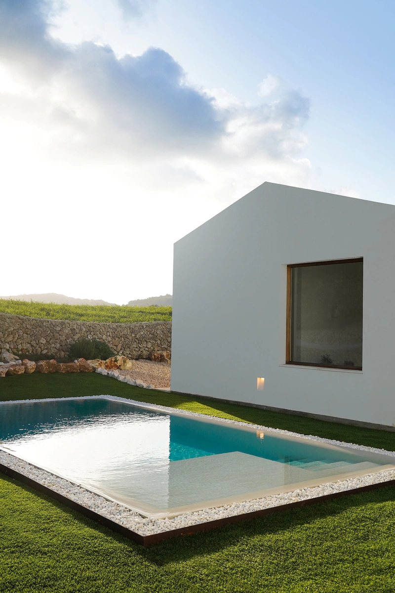 El blanco menorquín, tan mediterráneo, cede su protagonismo dentro de las habitaciones a los verdes, ocres y azules del paisaje. Y como buena isla, tampoco podía faltar un recuerdo del mar, aquí en forma de piscina en uno de los extremos de la parcela.