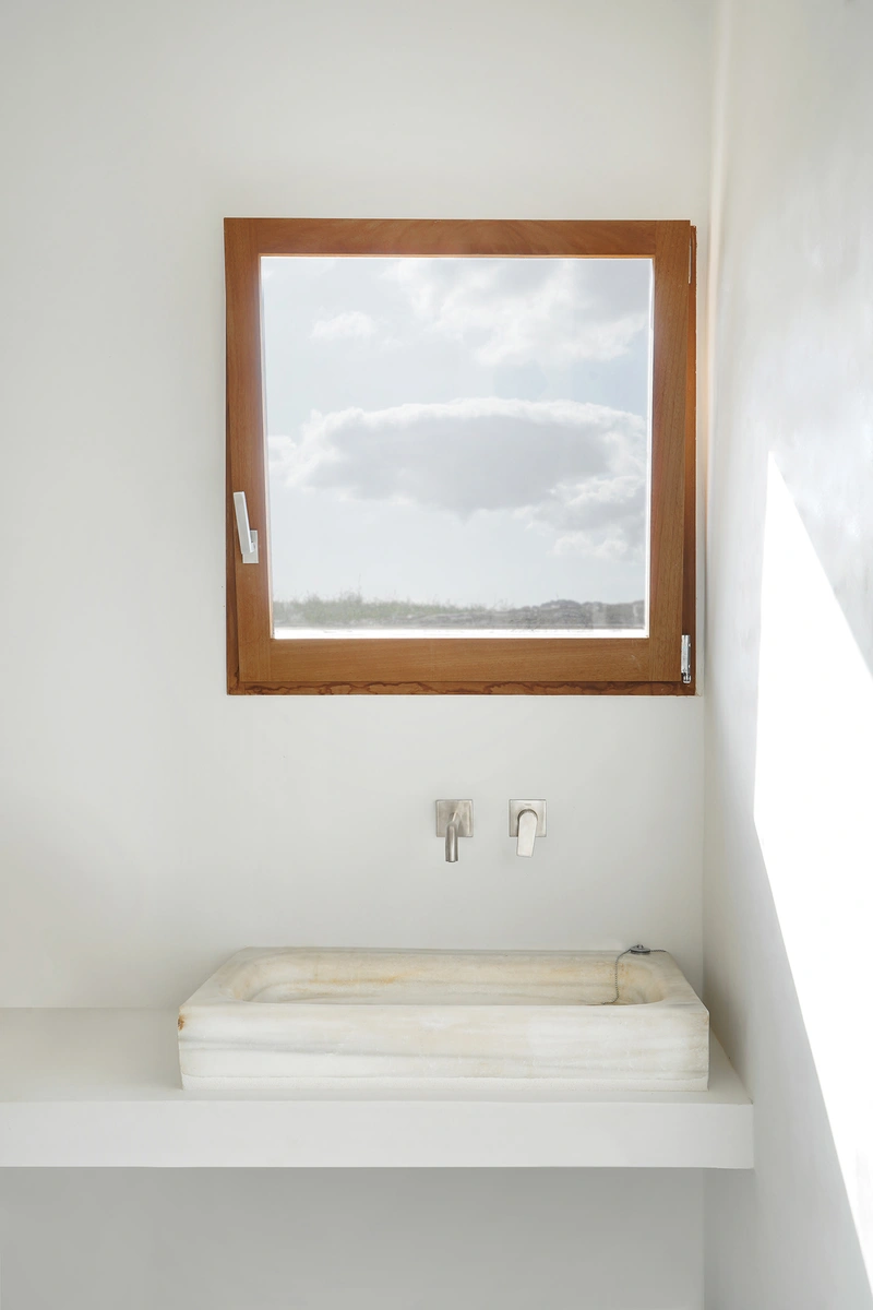 Como un reflejo de la envoltura externa, el interior de la Casa E se diseñó con el mismo espíritu minimalista y cálido. La carpintería de madera enmarca el campo menorquín en los grandes ventanales, transformados así en auténticos lienzos de la naturaleza que cambian de color según las estaciones y las horas del día.