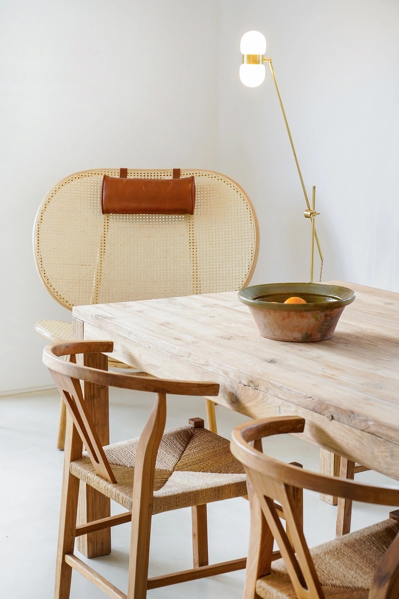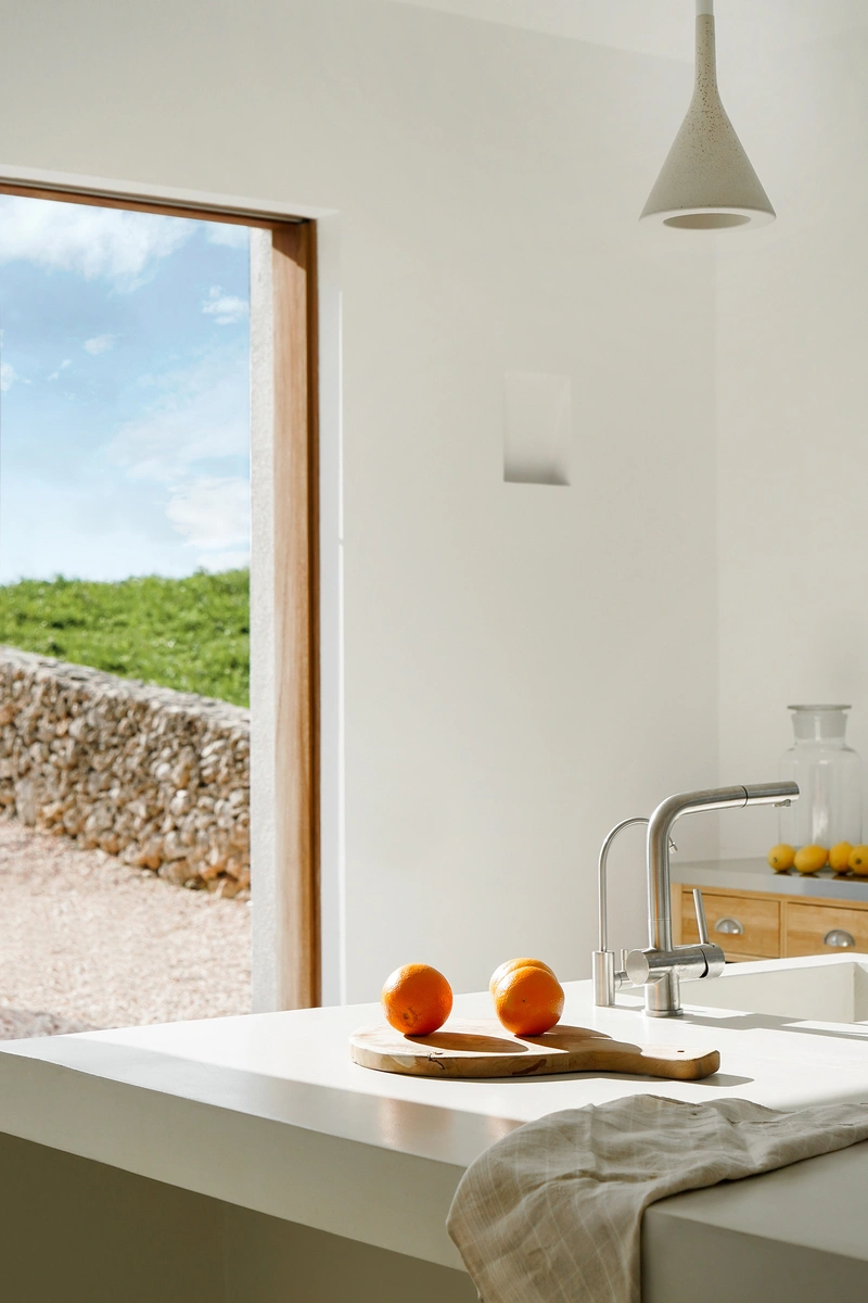 A su vez, unos pocos muebles de madera maciza subrayan el aire rústico de la vivienda, que se ilumina de noche con creaciones de la firma mallorquina Contain, como la lámpara de pie orientable Nuvol del comedor. Una luz que se procura integrar sin estridencias, casi mimetizada con los materiales y las tonalidades, algo que se aprecia muy bien en la cocina o en los discretos focos exteriores, ocultos a la vista.
