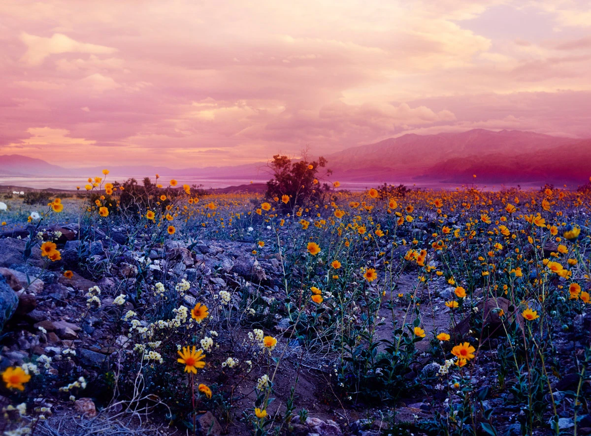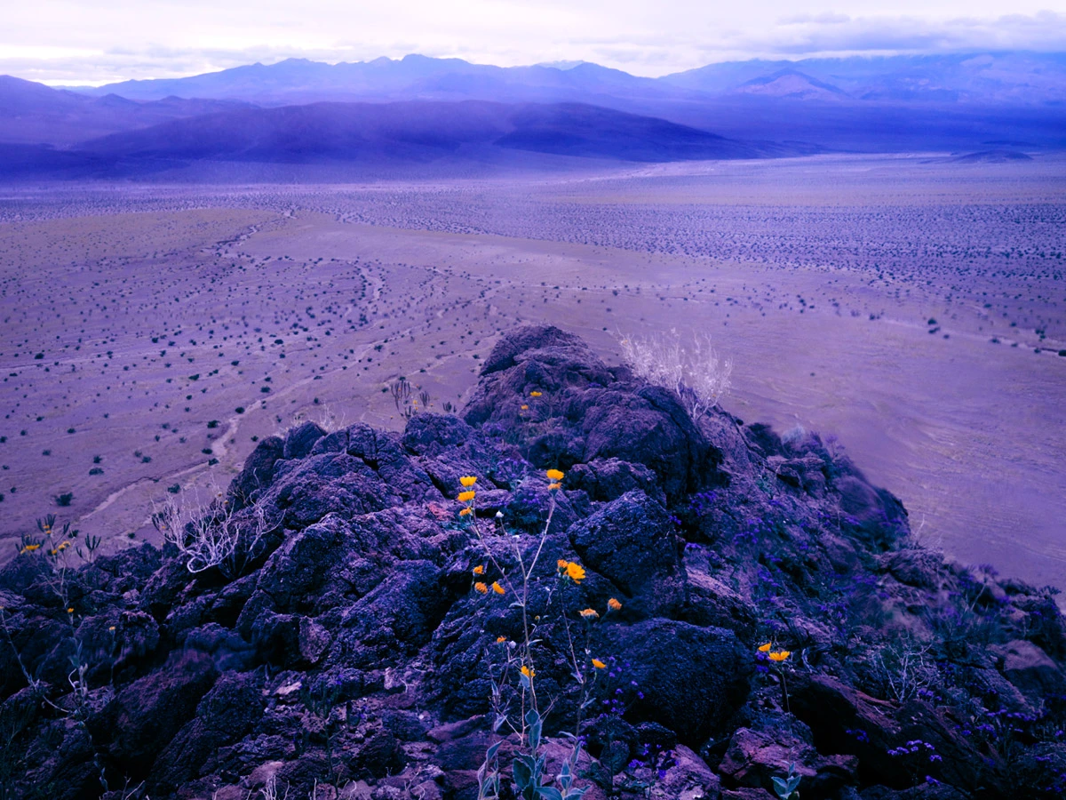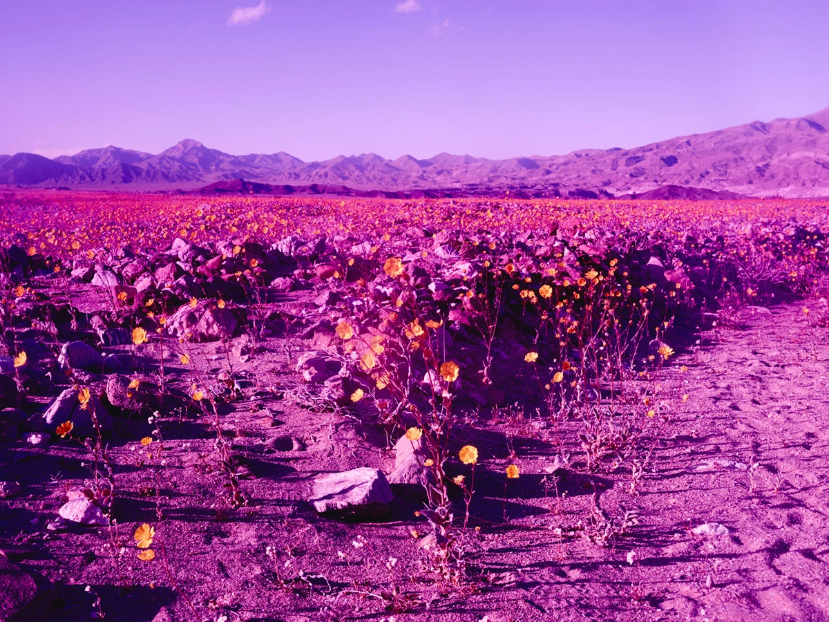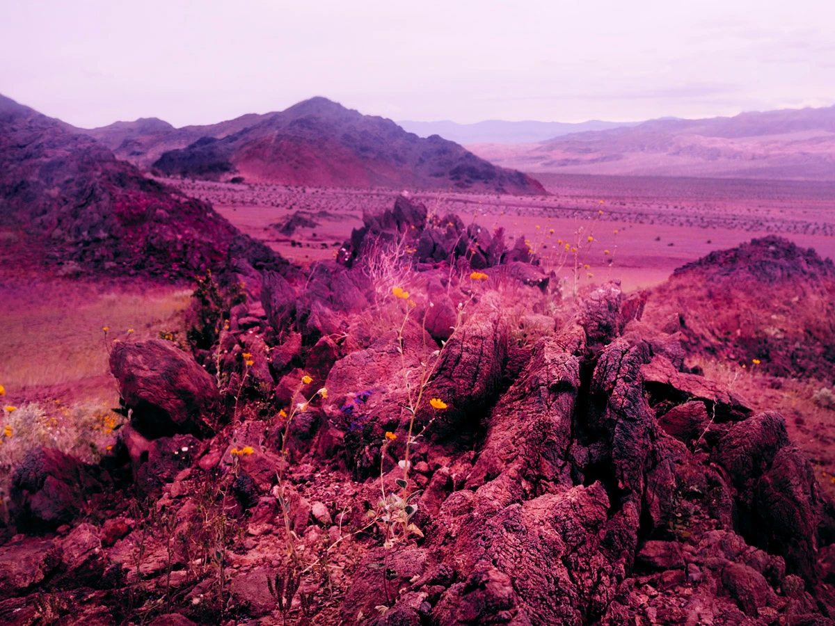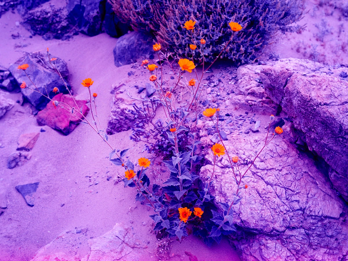 Estas postales alucinógenas parecen proceder de otro mundo, como si fuesen imágenes remotas enviadas a la Tierra por una sonda de exploración espacial lanzada hace años. Se adivinan las rocas y la arena, pero despojadas de toda sensación de calor asfixiante. En su lugar, los colores cálidos son recogidos por la floración espontánea, convirtiendo así un inmenso páramo en un lugar acogedor en el que dan ganas de adentrarse.