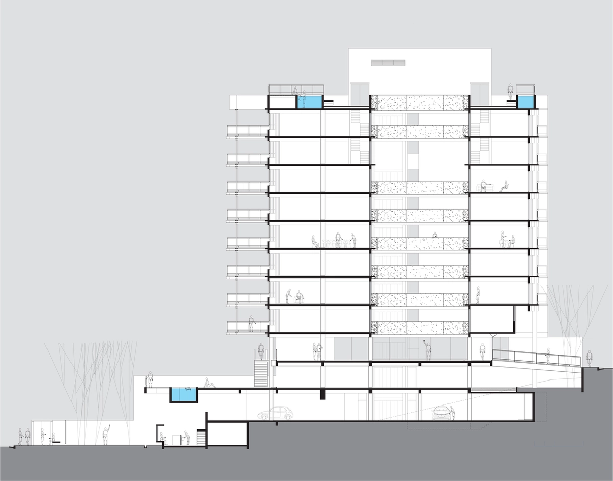 En un intento por revertir –o al menos, paliar– esta vorágine, surgió en 2011 el Edificio Residencial de la calle Simpatía. Obra del colectivo local de arquitectos Grupo SP, se planteó con el propósito de abrir un claro en ese bosque artificial aprovechando el relieve escarpado propio de los valles de la metrópoli y el desnivel entre las cotas de la calle Medeiros y la que da nombre al proyecto.
