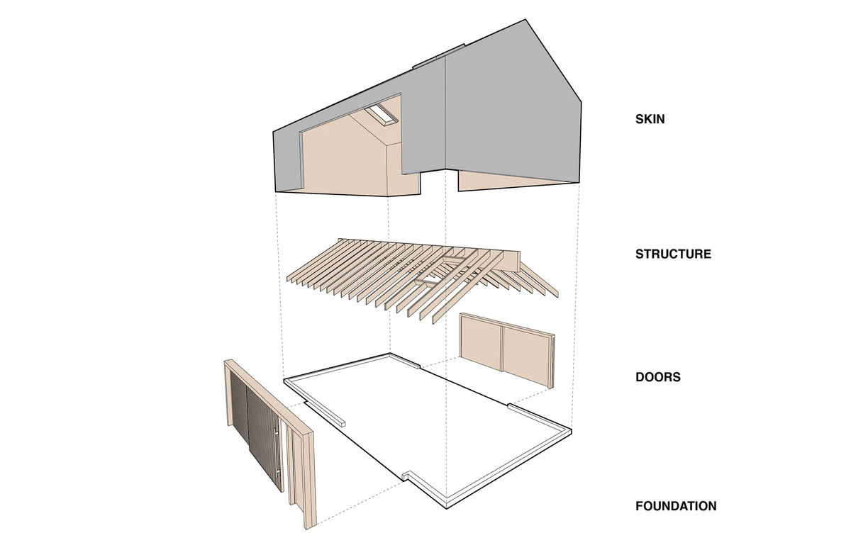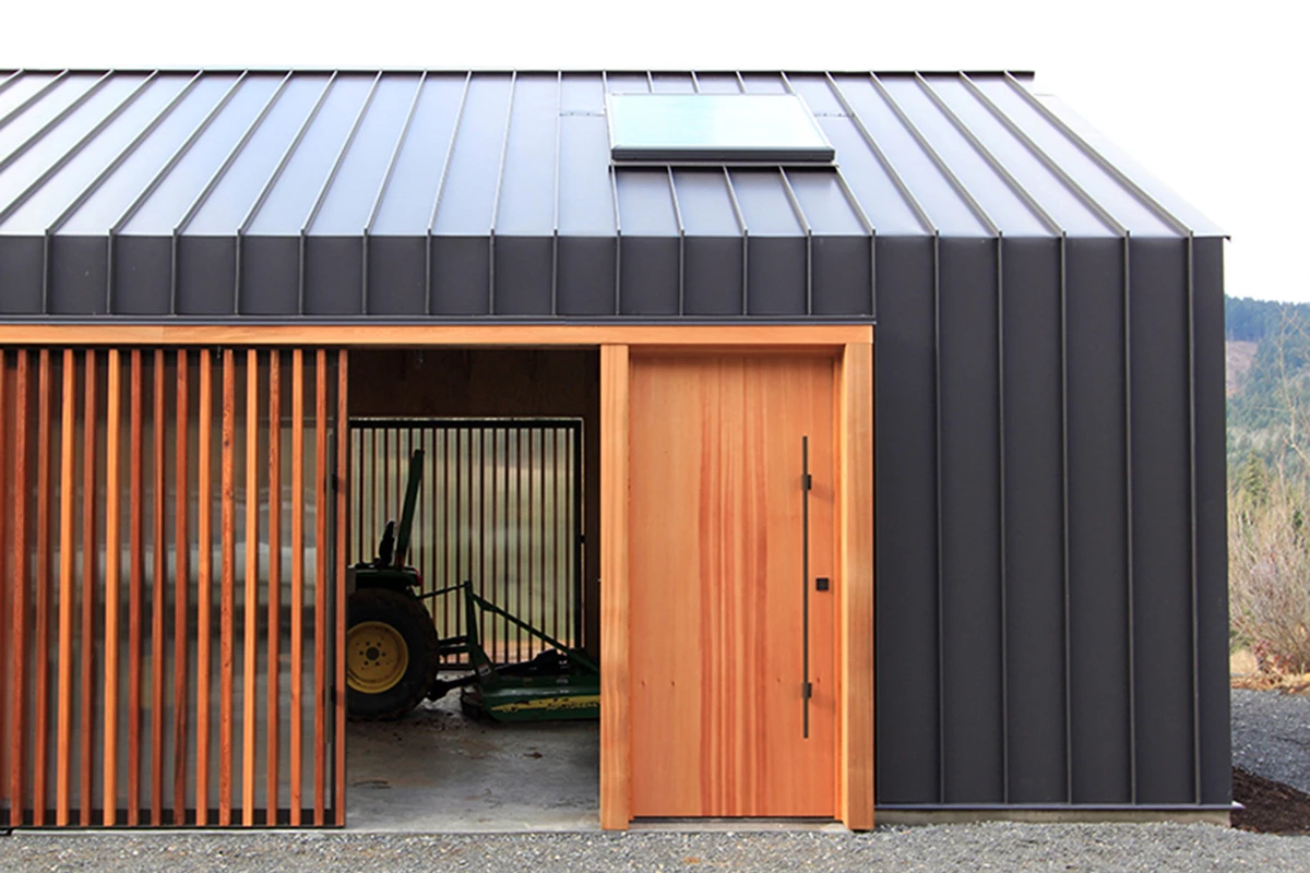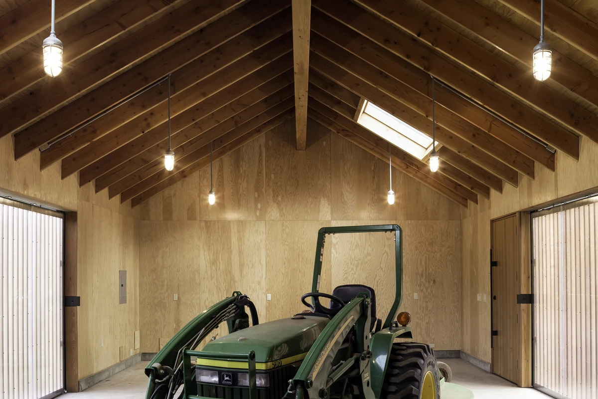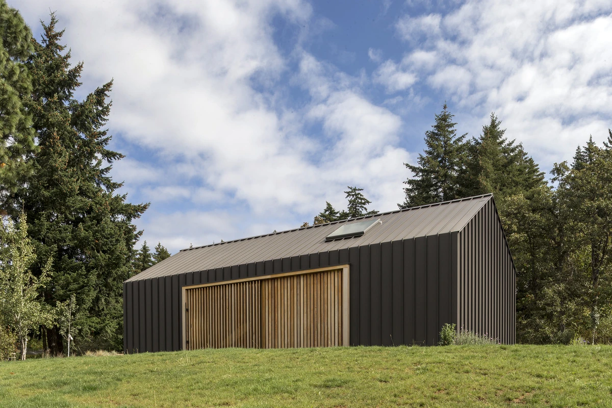 Esta bucólica misión estimuló al equipo creativo de Portland, que planteó una orientación norte-sur para armonizar con la pronunciada pendiente de los alrededores y el trabajo cotidiano de la granja. Tomando como referencia los materiales de la zona, se diseñó un artesonado ligero simple pero efectivo, recubierto por una piel metálica exterior ajustada a la perfección del tejado a la pared para lograr una estanqueidad perfecta.