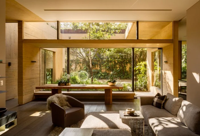 La mezcla de jardines colgantes y a ras de suelo aumenta la sensación de libertad, difuminando las barreras entre dentro y fuera. Además, el acabado terroso del hormigón visto, junto con el pautado visible de los listones del encofrado, potencian el aire natural de la construcción, despojando al material de su típica crudeza. Una sencilla geometría lineal define de este modo las estancias sin afán de protagonismo.