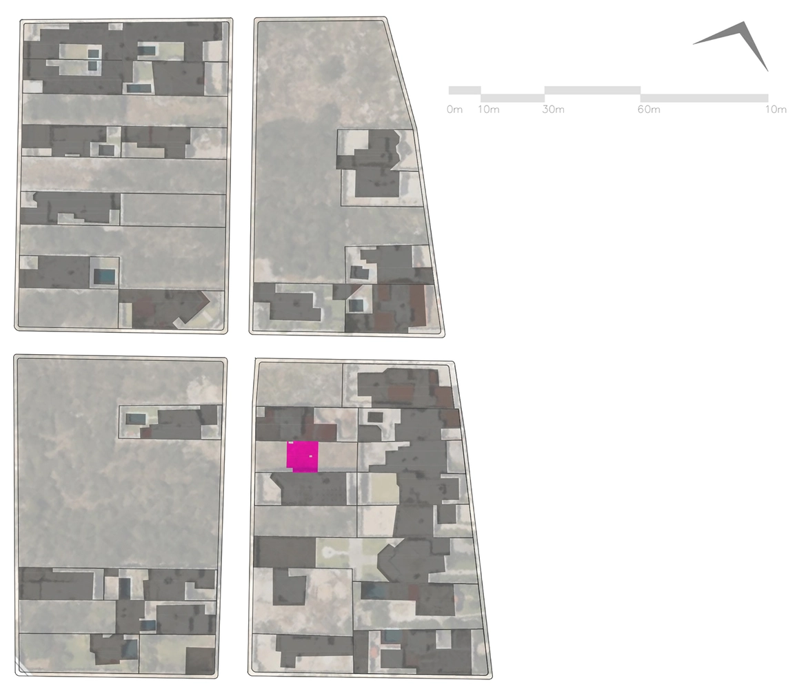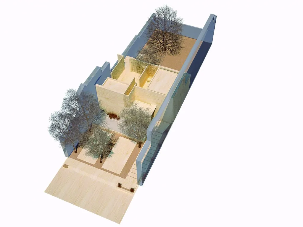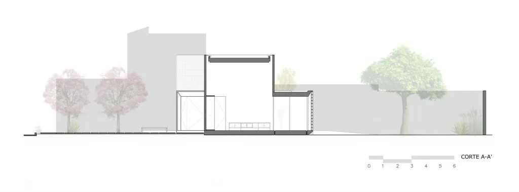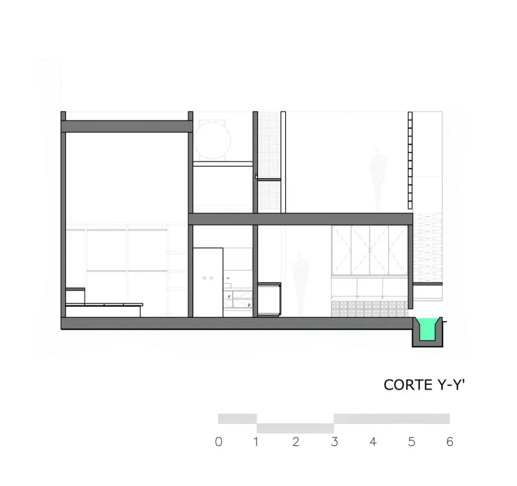 La planta baja se divide en una zona de encuentro, con sala de estar, cocina y comedor en una sola estancia, y un área privada con dormitorio, baño y cuarto de lavado. Desde ambas se accede a un gran jardín trasero y, por medio de una escalera interior, a un patio abierto situado en la azotea.