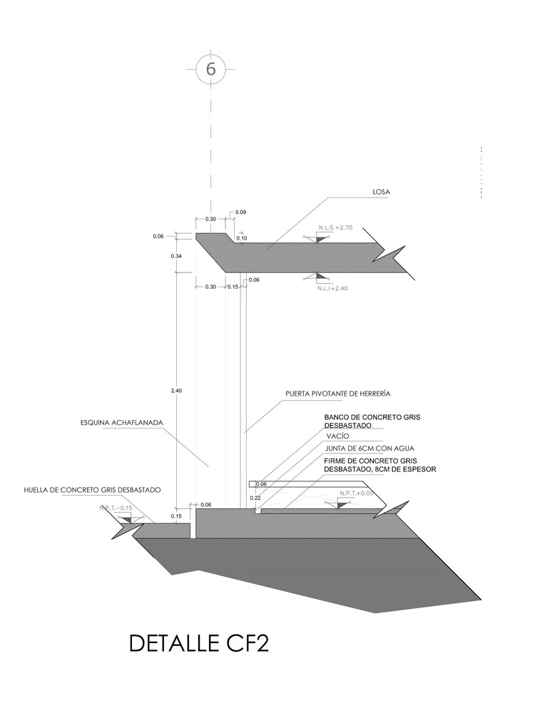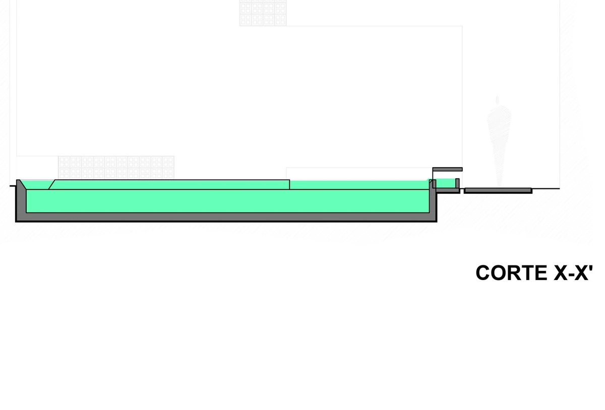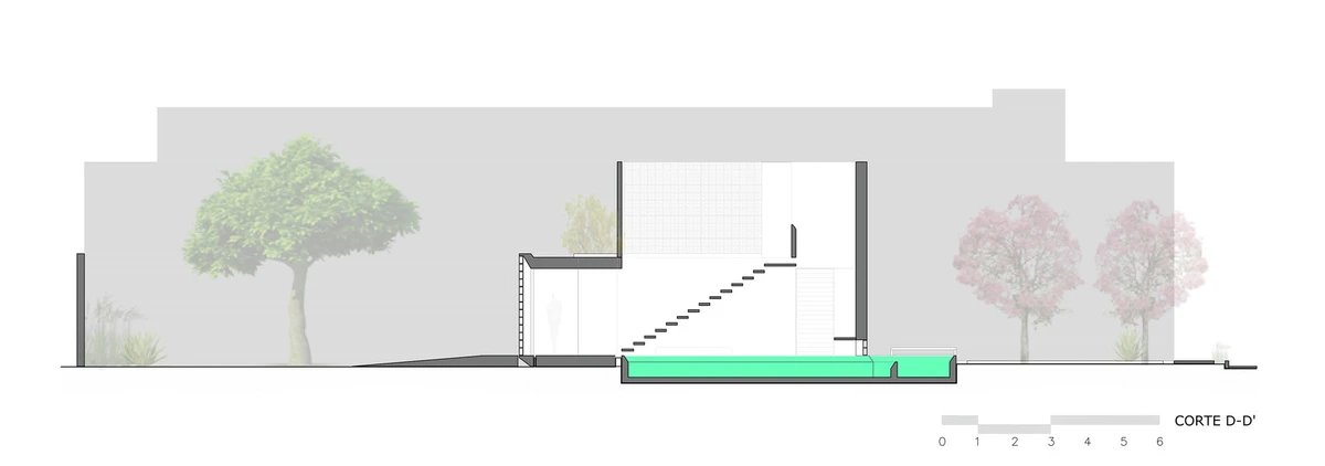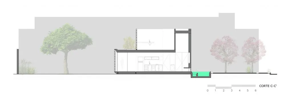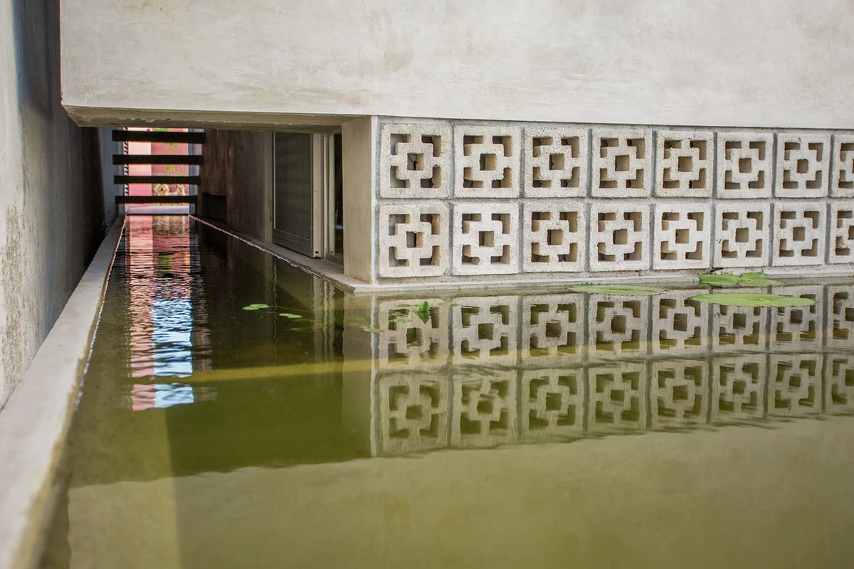 Lo primero que llama la atención es la zona exterior. En lugar de un acceso frontal a la vivienda, se optó por una entrada lateral, escamoteada desde la visual de la calle. Los muros de las construcciones vecinas se aprovechan para crear un espacio a medio camino entre público y privado, donde la incipiente vegetación autóctona, un banco de obra y un amplio estanque que penetra en la casa invitan a la calma.