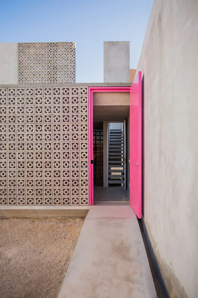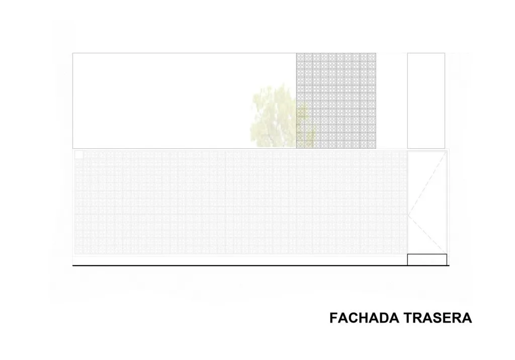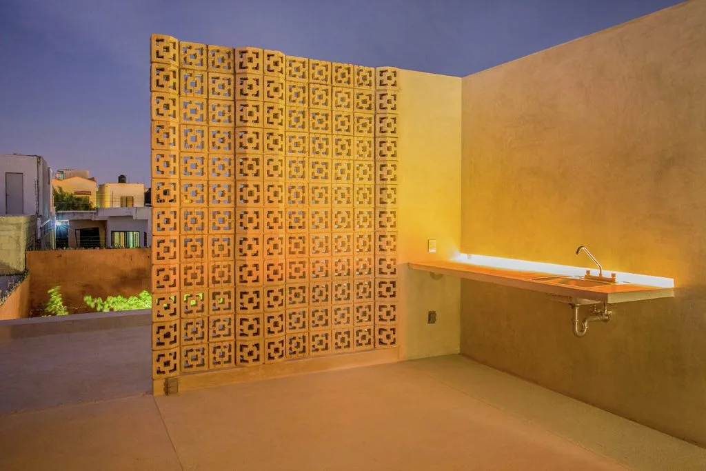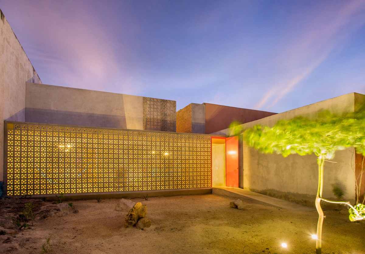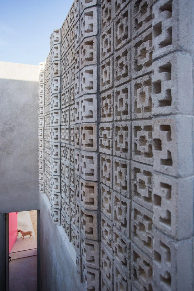 En cuanto a los materiales, se trabajó con bloques de cemento, viguetas y bovedillas. A destacar las extensas celosías de hormigón vibroprensado, que protegen la casa del sol y la lluvia, aportando además un patrón decorativo en una fachada de por sí espartana.