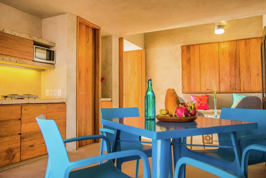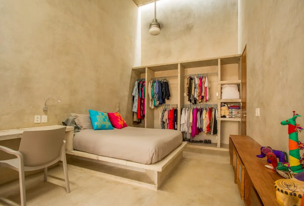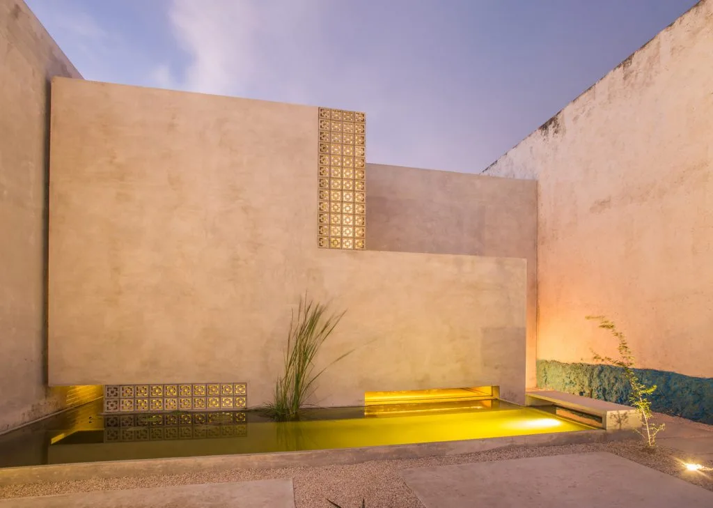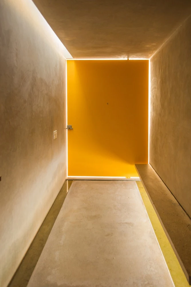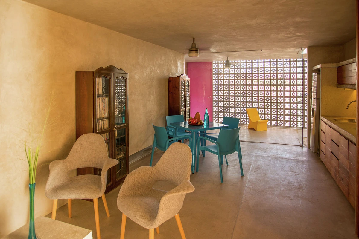 Los suelos son de hormigón pulido, mientras que las paredes y los techos bajos tienen un estuco de cemento impermeable bruñido. Un paisaje interior en tonos terrosos animado por toques puntuales de colores vivos tomados de la cultura local. Los muebles azul intenso o las puertas en fucsia o amarillo limón confirman el potente sabor maya de la Casa Gabriela.