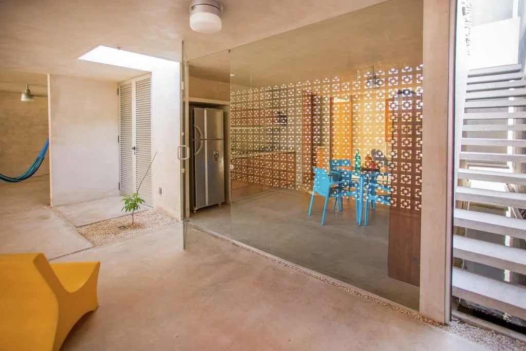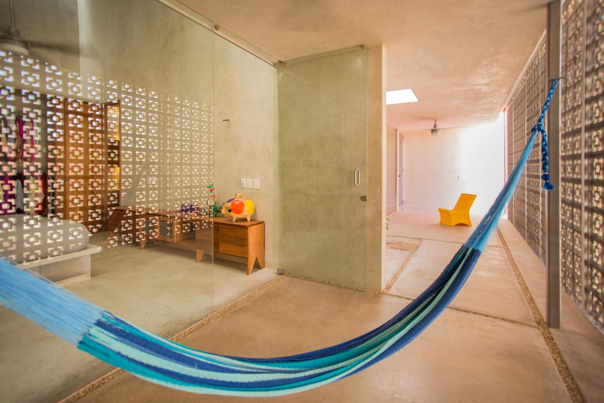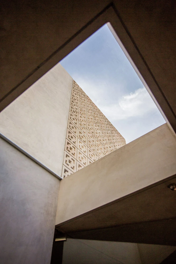 Los espacios a doble altura poseen aperturas cenitales que iluminan las habitaciones y hacen posible la salida del aire caliente, regulando así la temperatura interior de forma natural. El clima cálido de la región permite utilizar unas simples telas de mosquitero para cerrar los vanos.