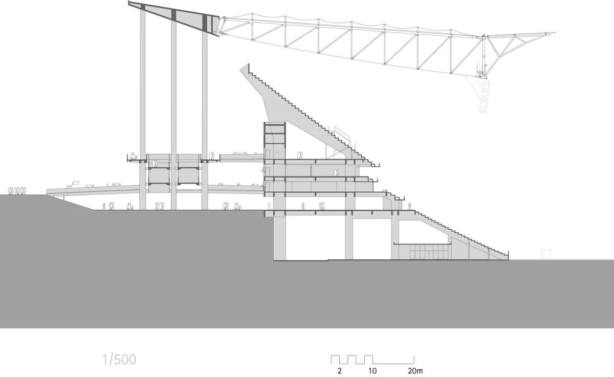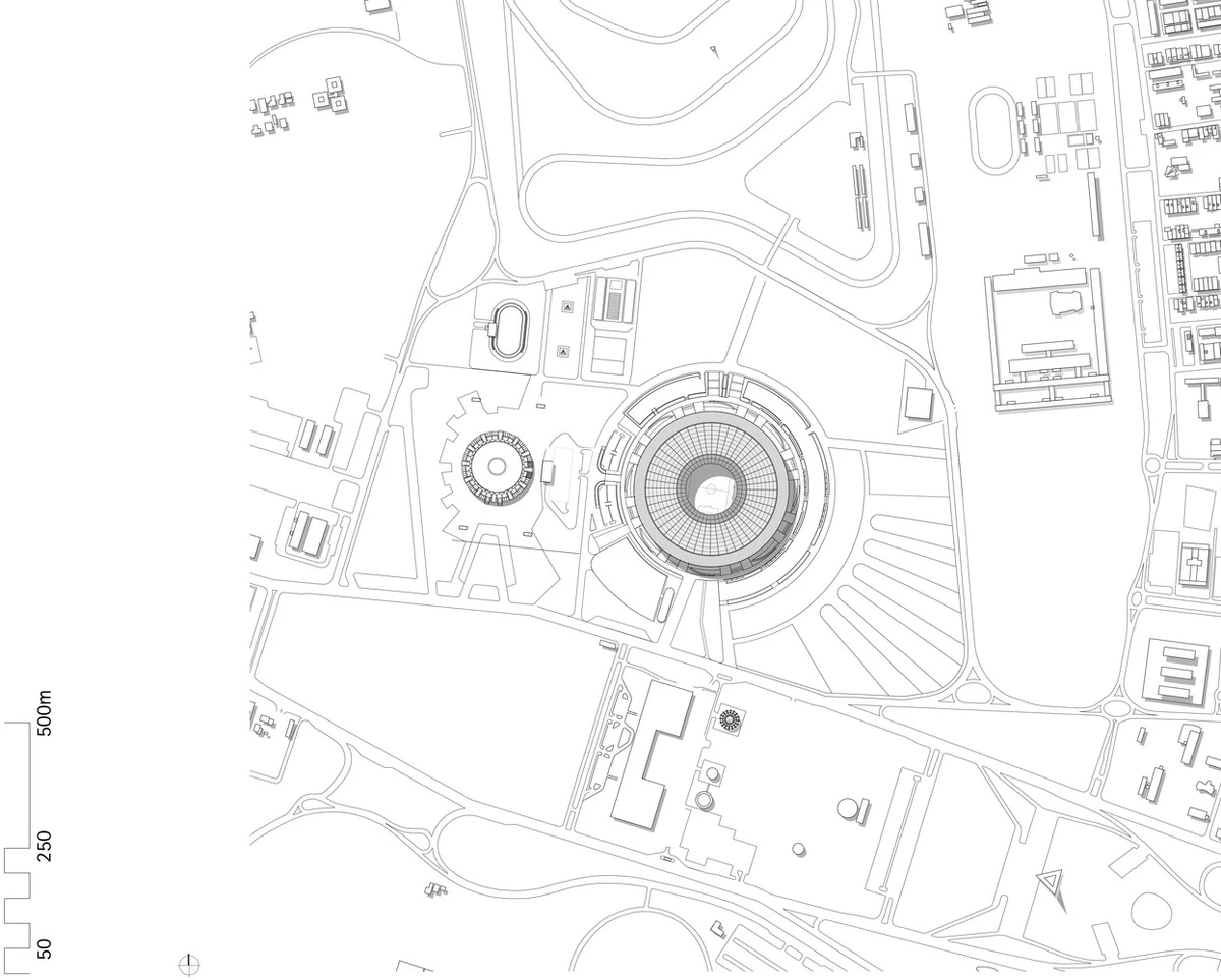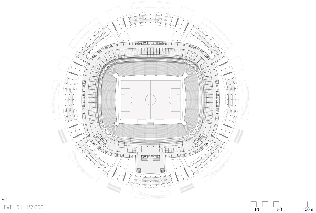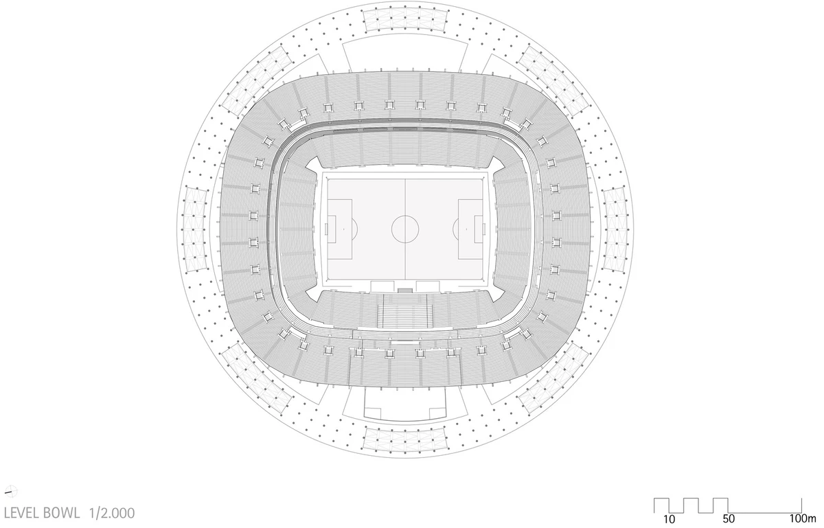 Y como se trata, al fin y al cabo, de templos y de ídolos, se hace inevitable aquí la analogía con el templo griego. En concreto, la composición del estadio evoca, literalmente, un tholos gigante, con su peristilo circular y un inmenso bosque de tres filas de columnas que hacen perfectamente legible el edificio desde la enorme explanada circundante. Y al igual que la sepultura del tholos, el terreno de juego está excavado en el solar, muy por debajo de la cota de acceso, lo cual reduce considerablemente la altura aparente del complejo. Después de todo, el tholos, no se olvide, era un monumento funerario. ¿Podría haber aquí alguna ironía?