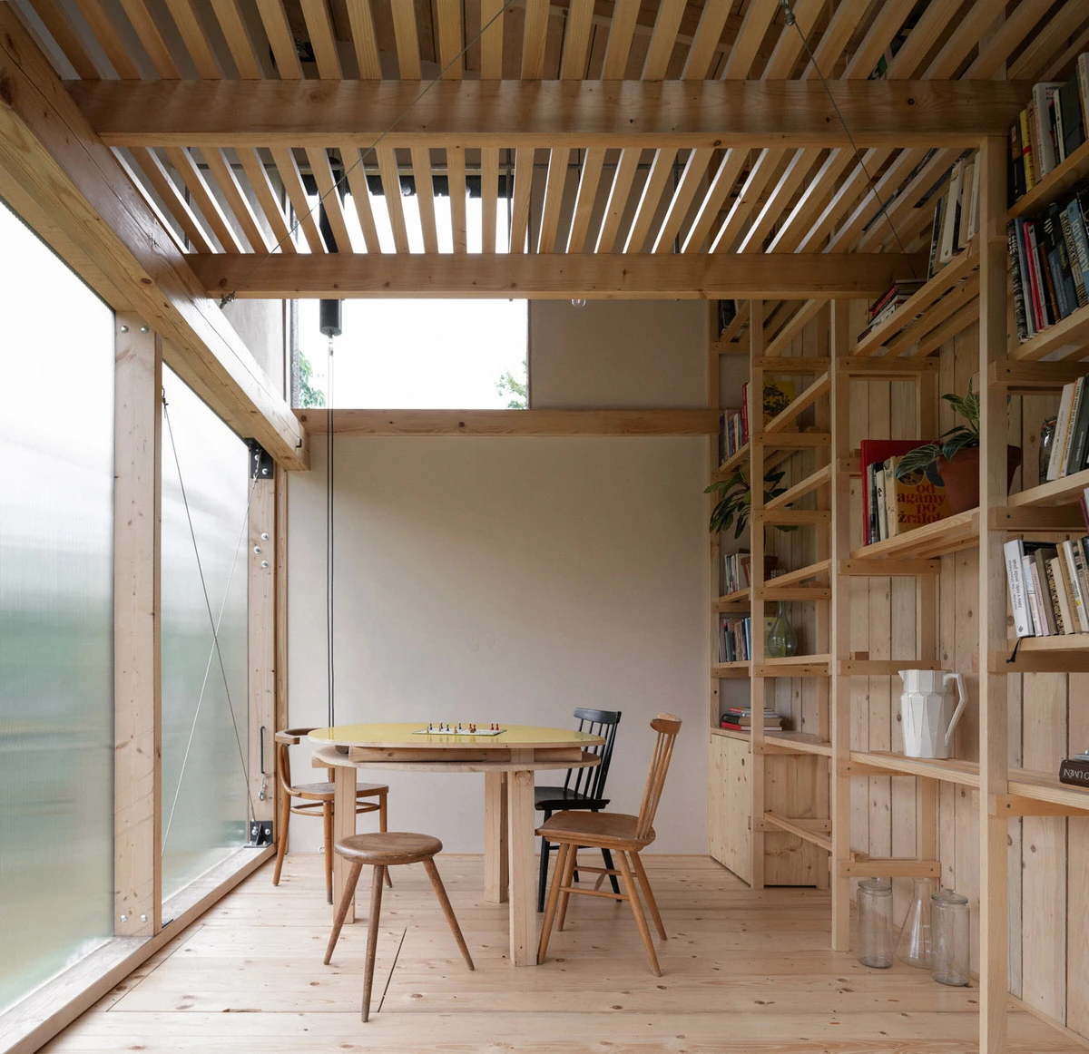 El interior, revestido con lamas de madera y paredes enlucidas, se organiza en dos niveles: una planta baja despejada y un altillo de descanso al que se accede por una escala integrada en una estantería de suelo a techo. La luz natural entra suavemente a través del panel translúcido, garantizando luminosidad incluso cuando la fachada está cerrada. No hay conexión a redes de suministro: una placa fotovoltaica provee la electricidad mínima necesaria para iluminación y pequeños aparatos.