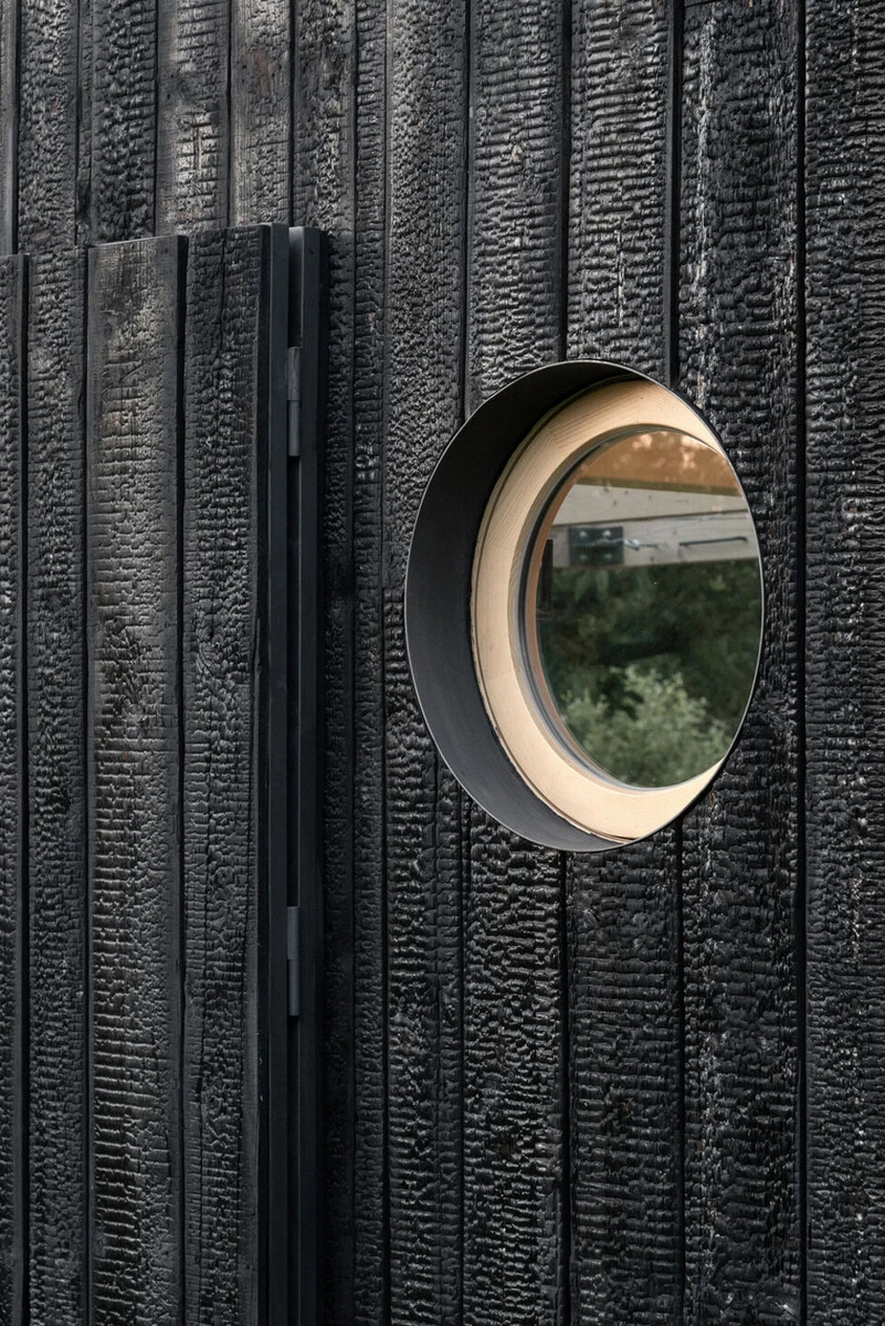 El edificio parte de una construcción sencilla en madera —un sistema de 2×4 con muros, cubierta e interiores en abeto— y se asienta sobre una base de hormigón preexistente. La envolvente exterior se reviste con madera de abeto carbonizada mediante la técnica japonesa del shou sugi ban, un método tradicional de preservación que además de aportar durabilidad, confiere una textura y una tonalidad únicas, entre lo artesanal y lo tectónico. Este acabado oscuro conecta visualmente con el resto de casetas vecinas, casi siempre opacas y envejecidas, pero lo hace desde una lectura deliberadamente actual.