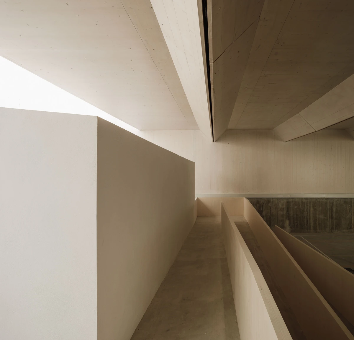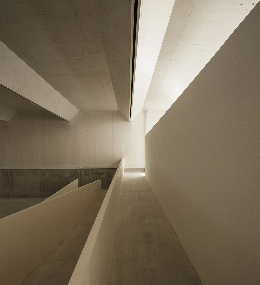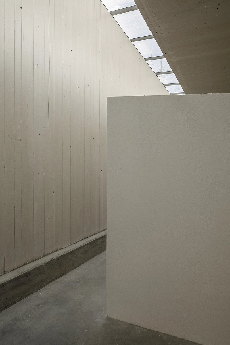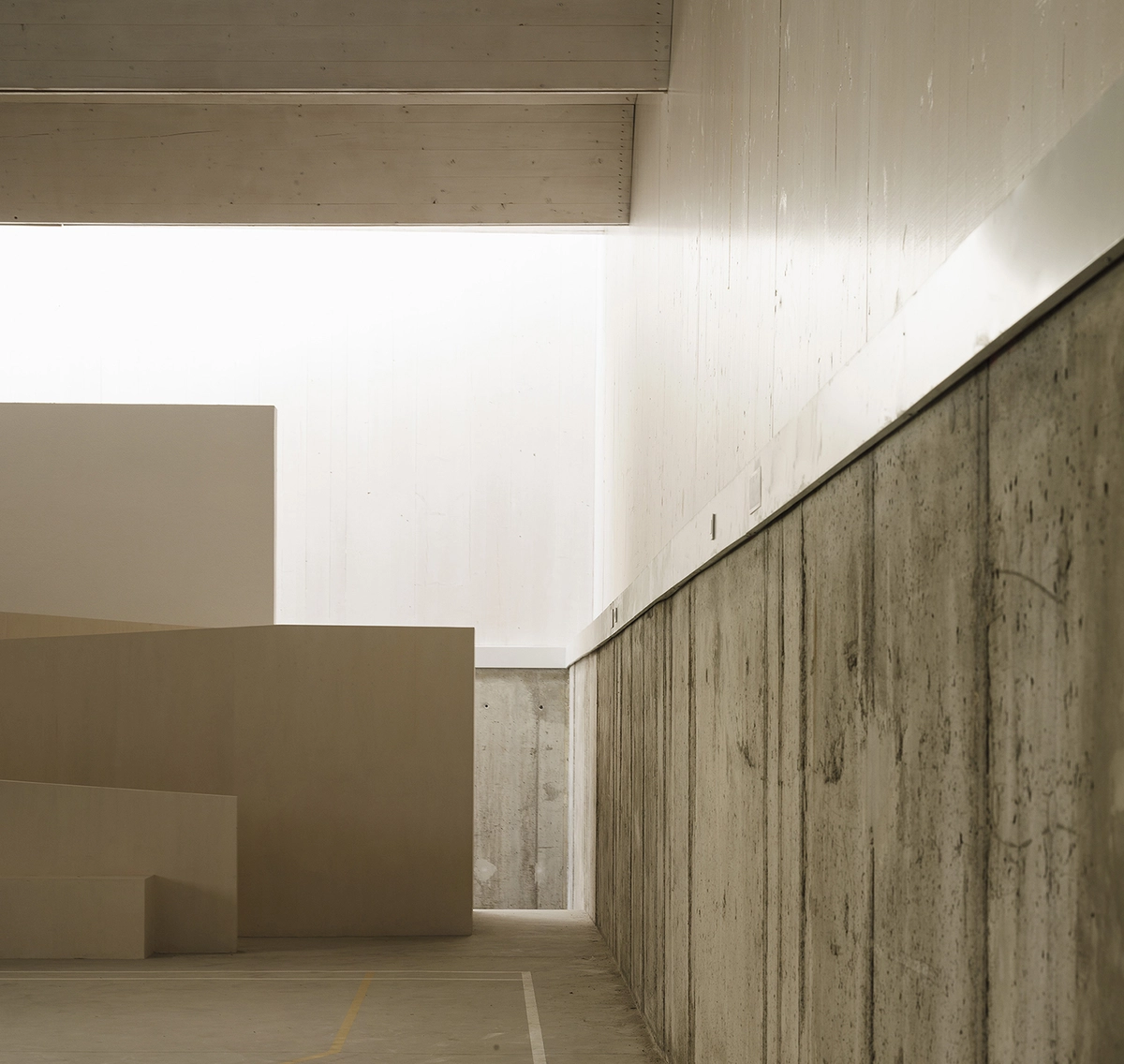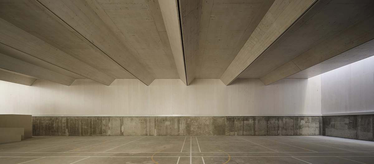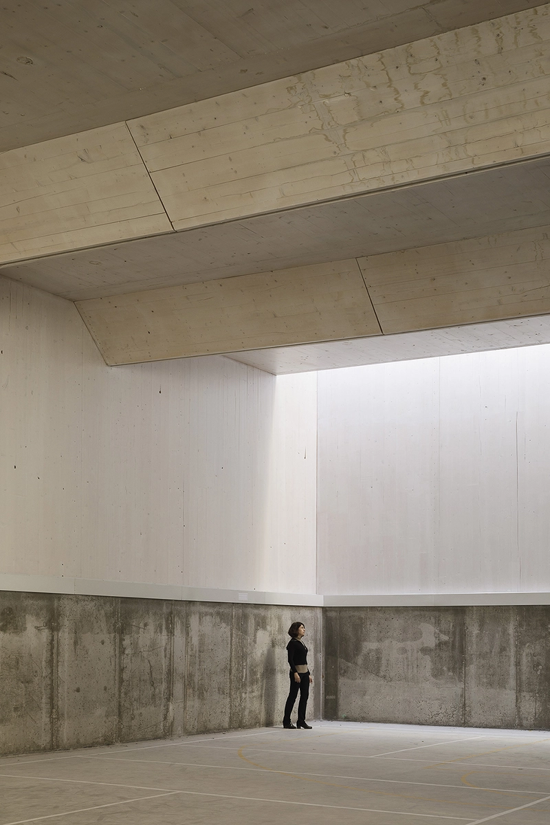 Los aportes de luz natural quedan asegurados por tres ventanas laterales y dos entradas cenitales en los extremos. En cuanto a la distribución, no puede ser más sencilla: se accede por la parte alta del pabellón, quedando a un lado los vestuarios y al otro una rampa que desciende en zigzag hasta la pista deportiva.