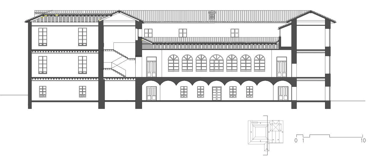 Con tres plantas de altura, la construcción se extiende alrededor de un patio central con limoneros, conservándose en los niveles superiores una galería de arcos cerrada que actúa como distribuidor. Justo esas plantas eran las más afectadas por el largo periodo de abandono, que había dado origen a humedades y vencimientos de cubiertas.