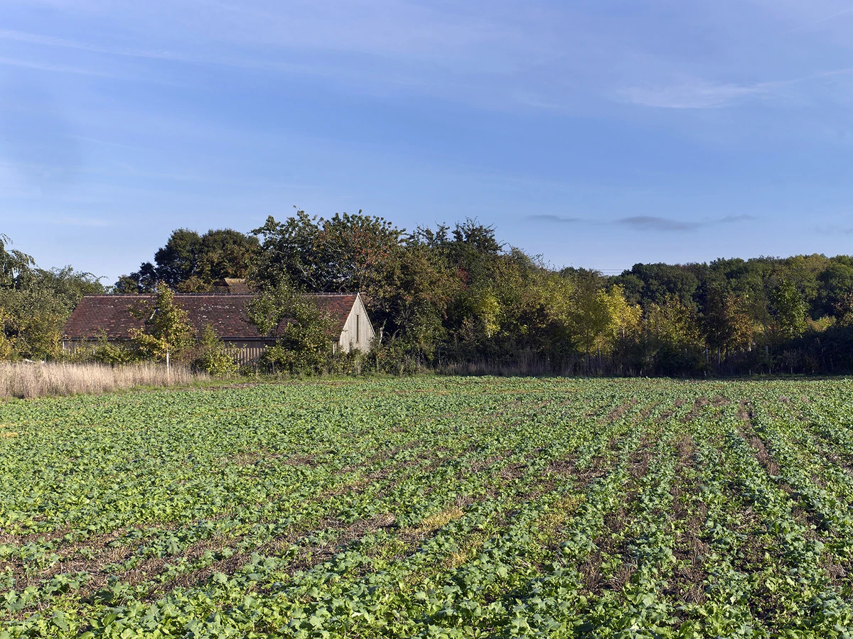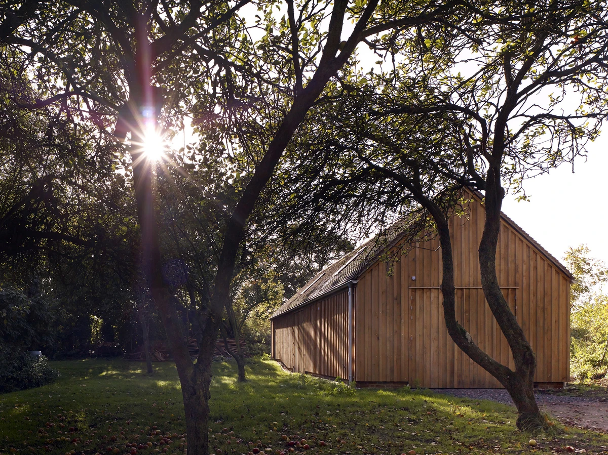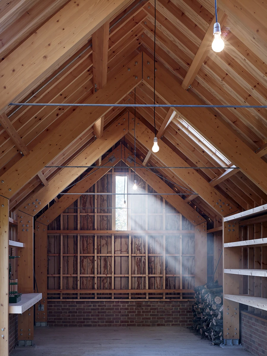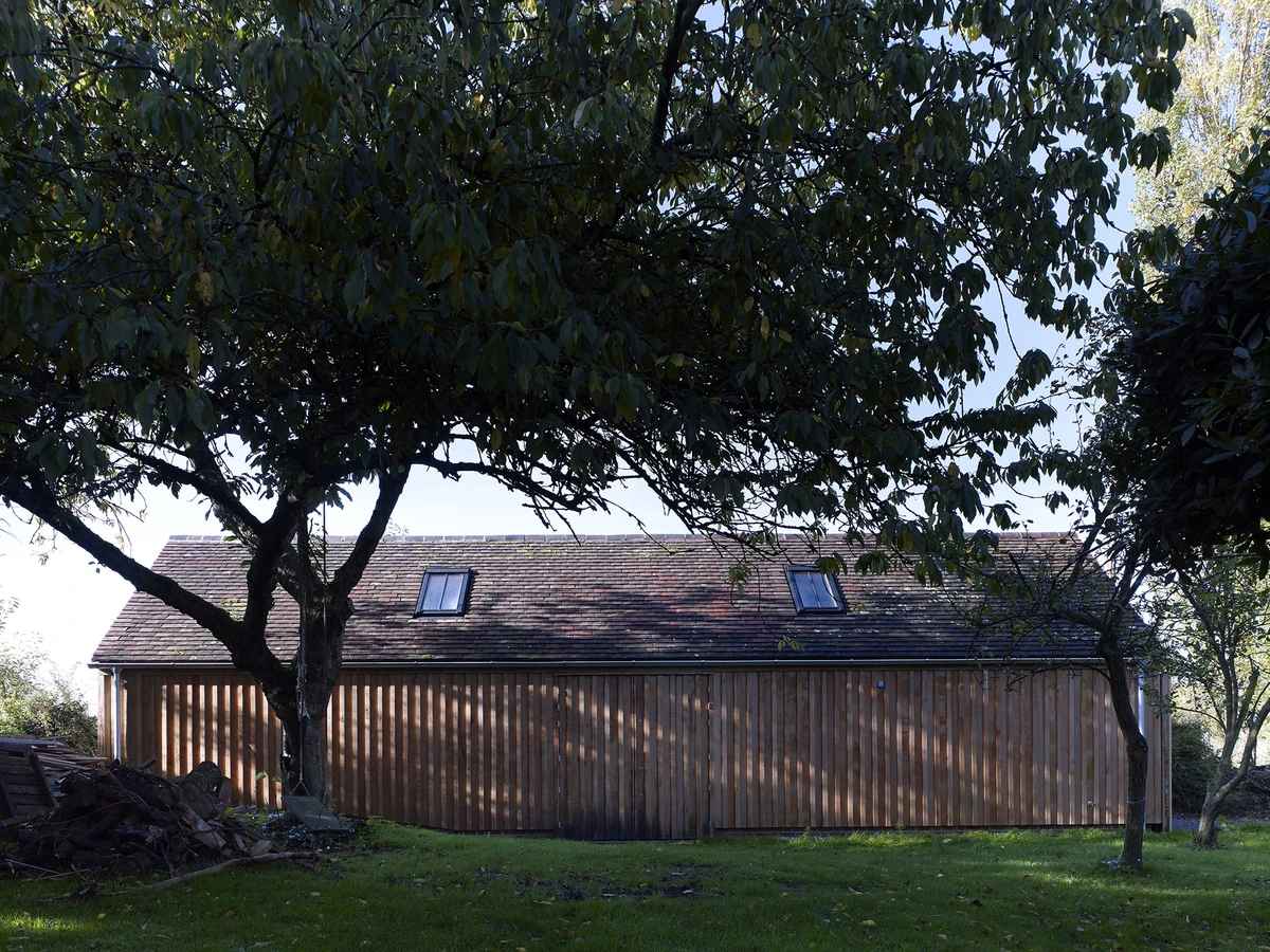El estudio londinense Cassion Castle Architects levantó esta estructura de usos múltiples en los terrenos de una antigua casa de campo en Hampshire, al sur de Inglaterra. Su cliente, Tom Lloyd, diseñador y cofundador de la firma británica PearsonLloyd, tiene allí su residencia habitual y deseaba una configuración polivalente que funcionase como estudio, taller, garaje y almacén, además de encajar en ese entorno rural inglés.