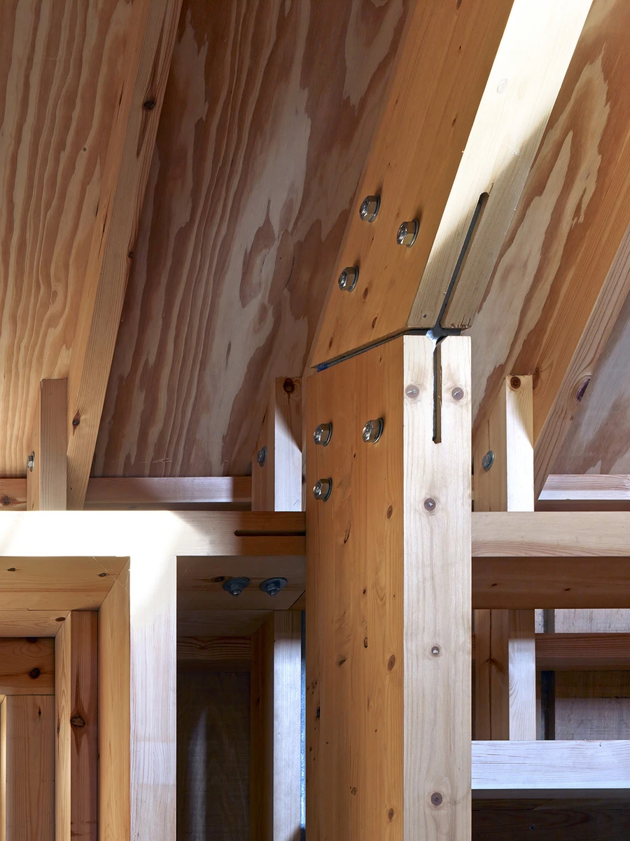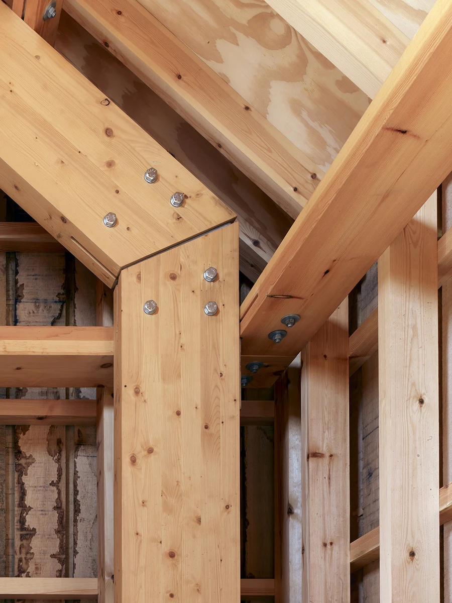 En cuanto al interior, ofrece un contraste visual realmente interesante con respecto a la espartana uniformidad externa. Aquí, los elementos de soporte de la estructura en madera laminada se han usado además de manera decorativa, convirtiendo los espacios entre capas en áreas de trabajo, estanterías o zonas de almacenamiento. Las placas y las fijaciones de acero galvanizado al descubierto acentúan las formas y la presencia del ladrillo y la madera.
