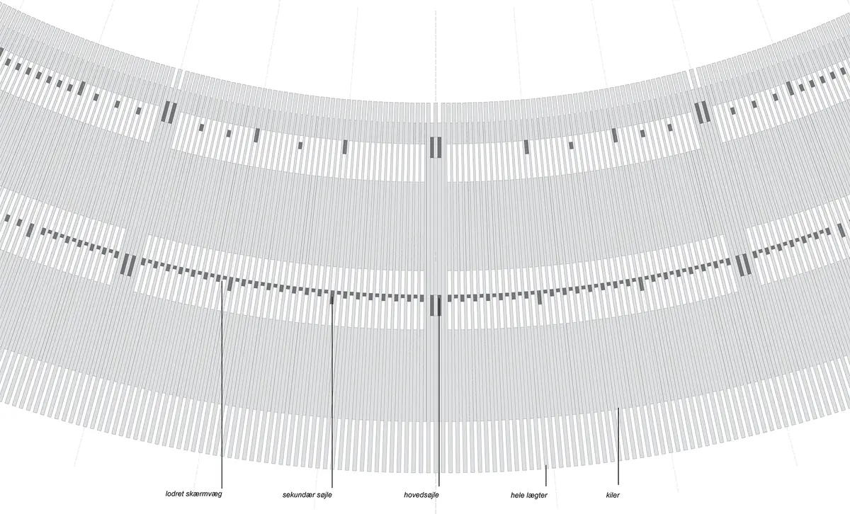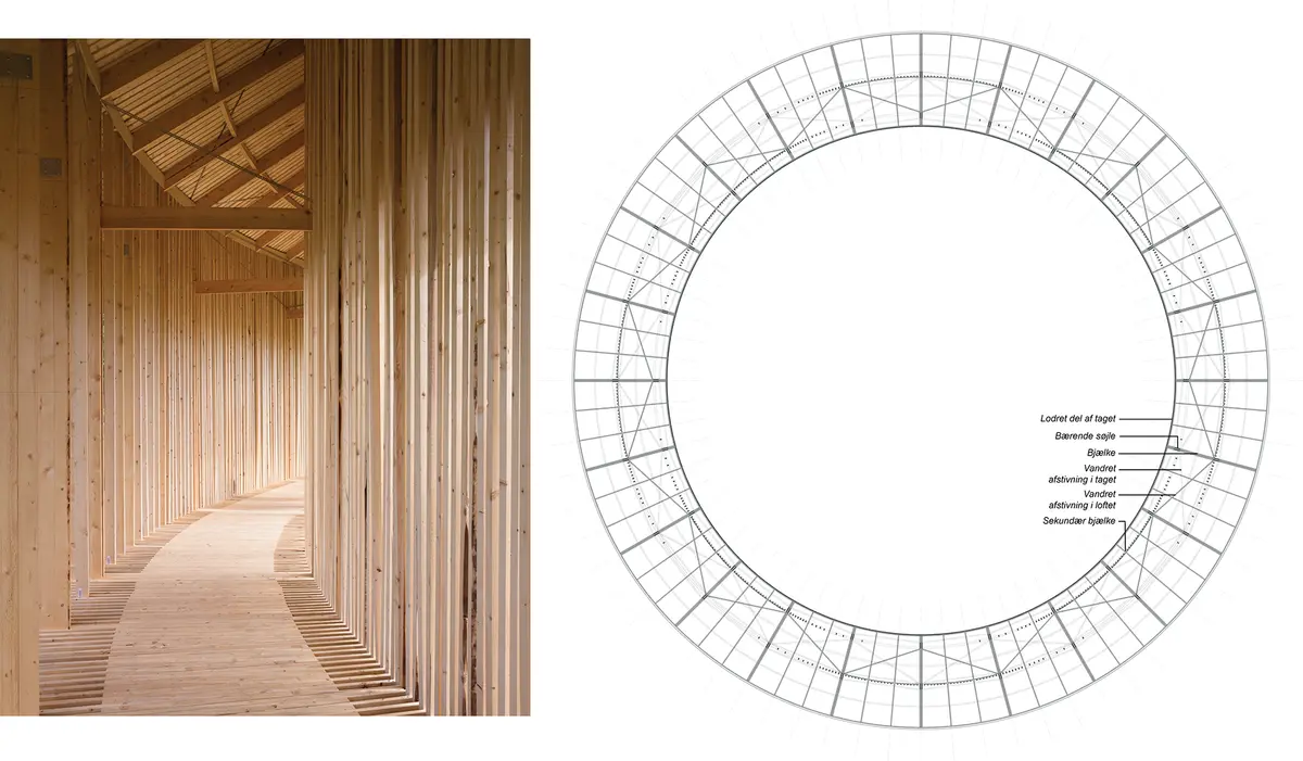 La elección del anillo como solución compositiva tiene aquí su lógica, pues delimita tres espacios eficazmente diferenciados en el proyecto: el exterior del recinto, el peristilo y pasillo circular cubiertos, y el espacio al aire libre que el edificio rodea. El intercolumnio regular de un thólos se sustituye aquí por múltiples postes de madera de distinto grosor y sección a ambas caras del anillo, algunos estructurales y otros como simples creadores de espacio para delimitar el pasillo y separar el interior del exterior. A su vez, el número y densidad de estos postes, impecablemente detallados, está escalonado por tramos en ambos lados, creando así un elegante juego visual que desde fuera permite entrever el espacio abierto central e intuir desde el interior el tránsito en los jardines.