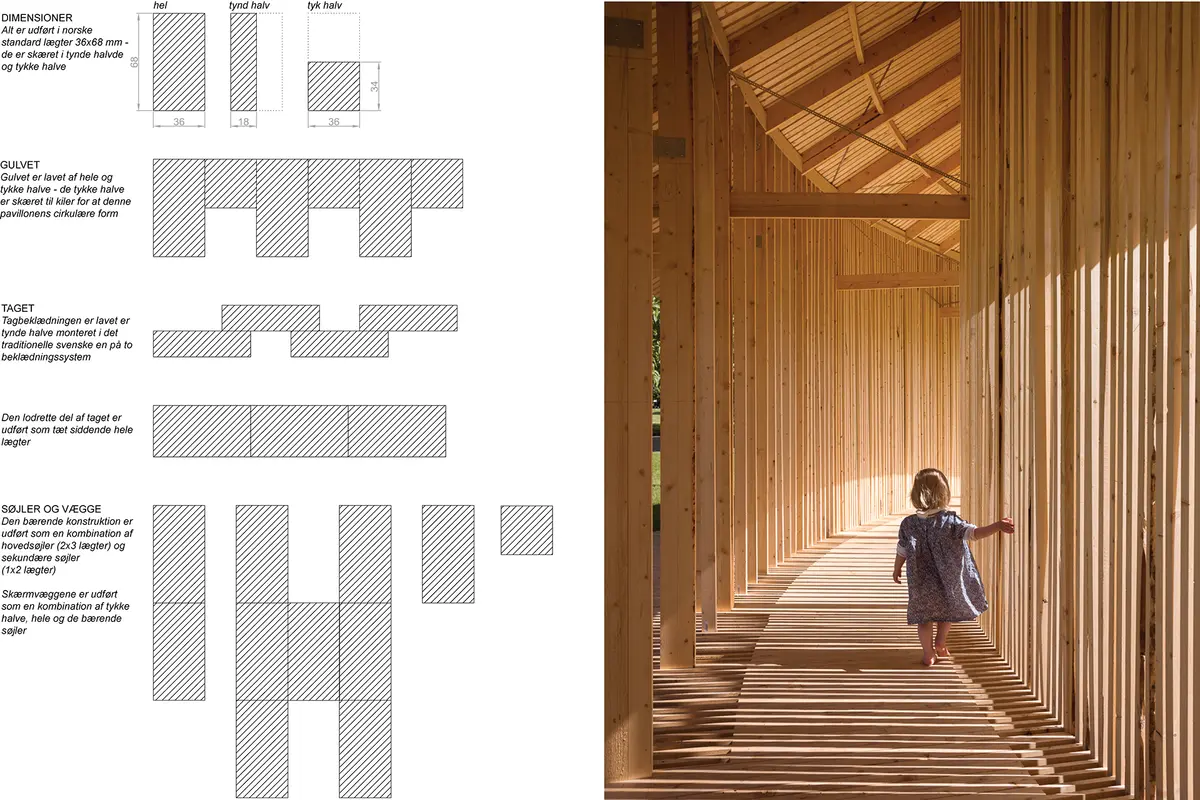 En una explanada de césped en los jardines adyacentes al Castillo de Rosenborg en Conpenhague, los arquitectos daneses Christiansen & Andersen han levantado un interesante pabellón anular íntegramente construido en madera. Desde fuera, el edificio parece asemejarse a una versión moderna del thólos griego, destinado en esta ocasión a fines lúdicos.
