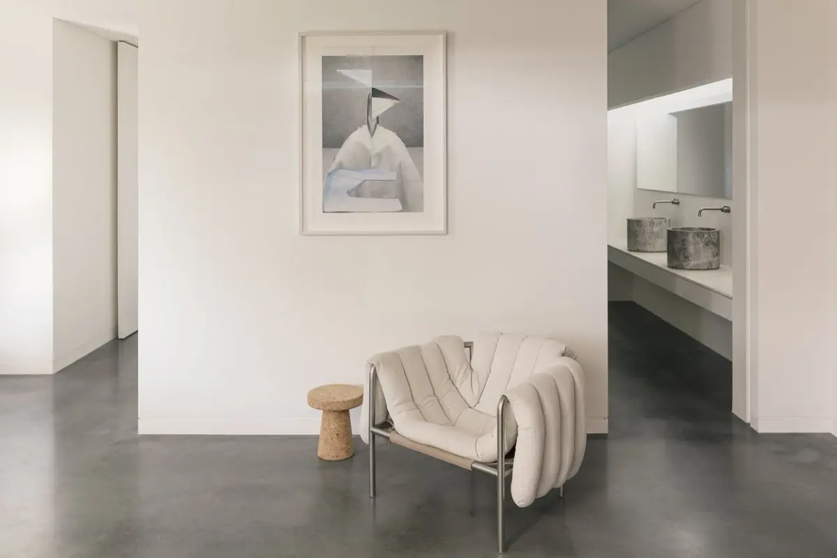 El uso de pavimentos continuos y acabados neutros combinan a la perfección con el mobiliario elegido: una mezcla de elementos diseñados para el lugar y de objetos antiguos recuperados y reciclados, que aportan un toque de calidez al rigor formal de los espacios.
