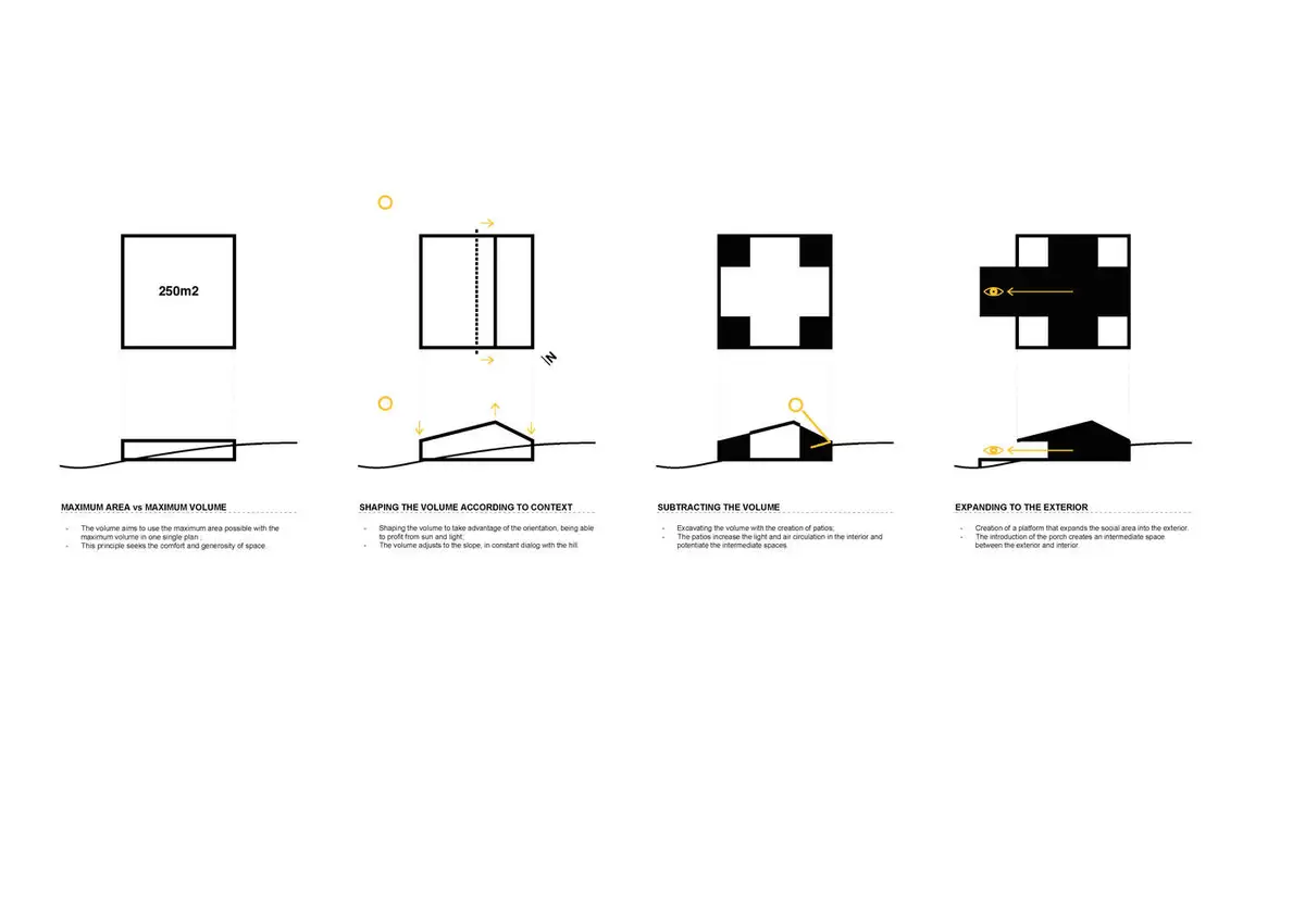 De un solo piso en planta cuadrada (unos 250 m2 de superficie construida), la vivienda se organiza con una lógica y claridad inapelables. El cuadrado se recorta en cada esquina para crear cuatro patios interiores. De esta forma, dos lados opuestos del cuadrado quedan reservados para los baños, los armarios y las dos habitaciones principales, que dan a sus respectivos patios.