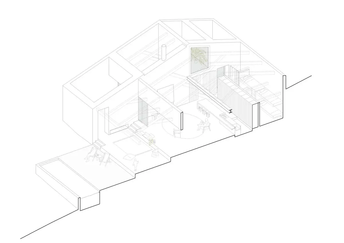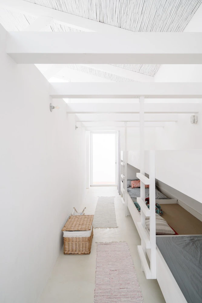 Al fondo de la casa, una zona de literas para niños o invitados queda también comunicada con patios para la luz, la ventilación y el aseo. El gran espacio restante es el núcleo de la vivienda, totalmente diáfano e inundado de luz.