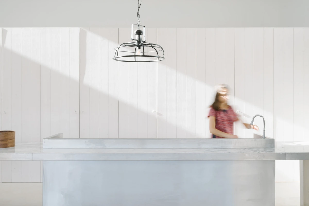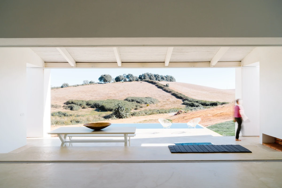 Una cocina con techo altísimo se ubica al fondo de la sala, y una mesa corrida de granito la separa de un amplísimo salón-comedor con una enorme apertura sobre la que reposa la cubierta y por la que asoma una maravillosa vista del campo, alejándose con la pendiente natural del terreno. Cuando sus puertas correderas de vidrio se abren y esconden plenamente en los muros laterales del salón, todo ese espacio interior se funde con una sencilla terraza, con una piscina a ras de suelo y con la extraordinaria panorámica del entorno.