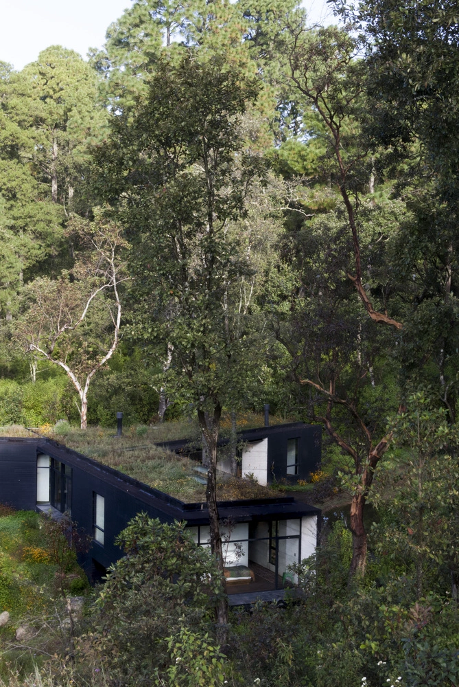 Destacan también los acabados de esta obra, como la cubierta vegetada que, junto a la baja altura del edificio, la camuflan entre el denso arbolado. Asimismo, el hormigón de las fachadas ha sido expresamente pintado en negro para minimizar su impacto visual en el bosque y facilitar su mantenimiento. En el interior, las vigas expuestas de madera, los muros de hormigón visto y los suelos, también en madera o en gres, ofrecen un ambiente cálido y acogedor. En suma, un capricho muy logrado.