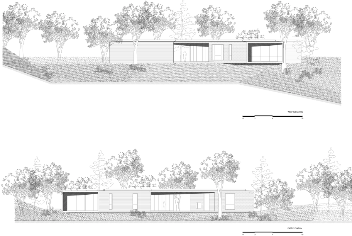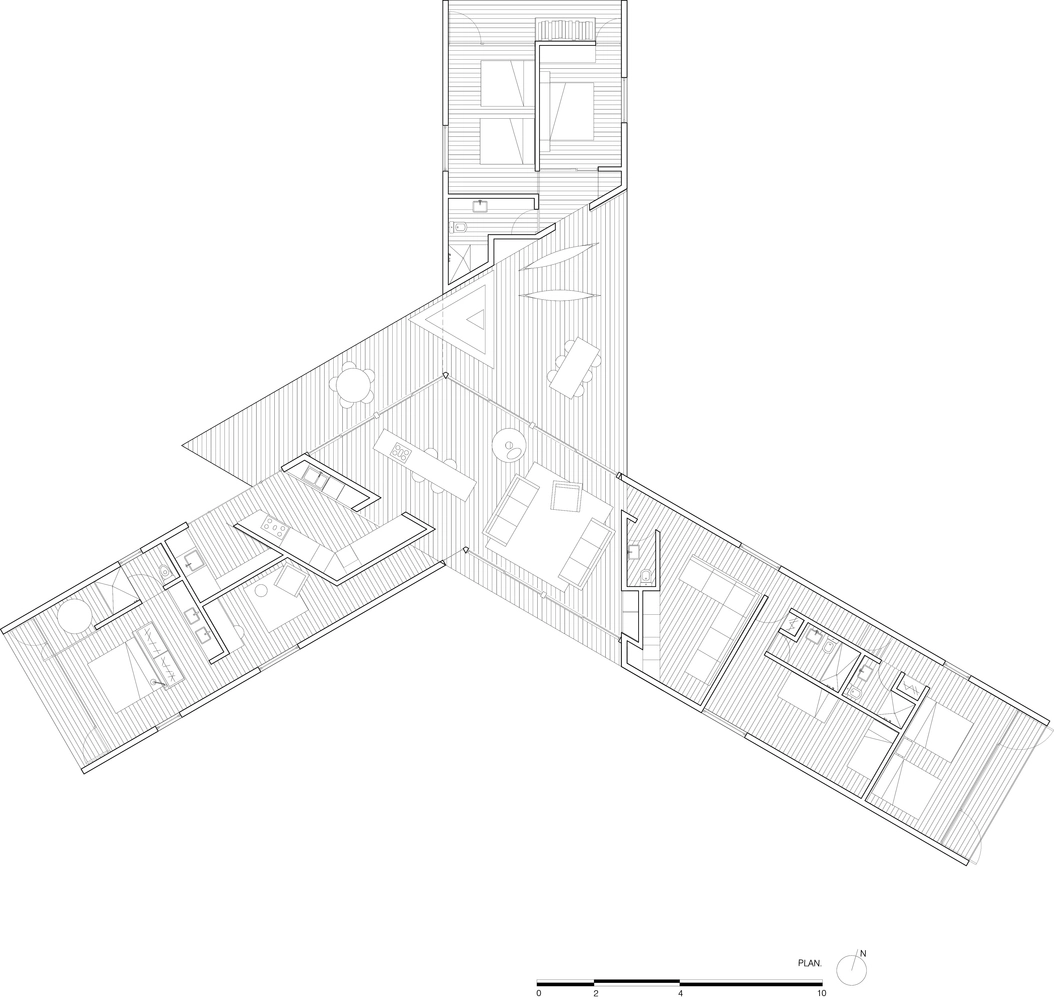 La casa se divide en tres alas que se extienden hacia el bosque con el fin de explotar al máximo las bellas vistas de su entorno. Cada ala se reserva a las zonas más privadas de la casa, con las habitaciones principales al fondo, culminando en grandes ventanales de suelo a techo y en balcones que actúan como miradores al bosque (uno de ellos con leñera incluida).