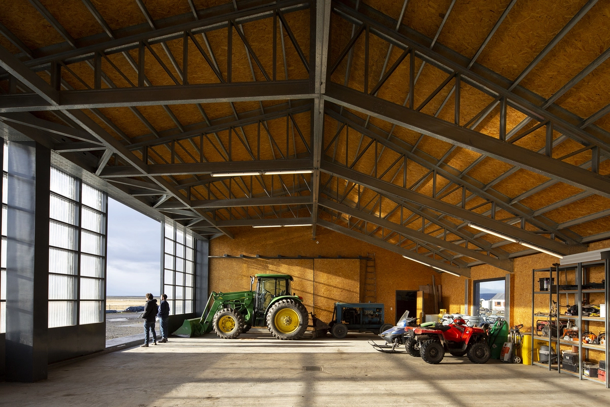 La calidez de los revestimientos interiores de madera se equilibra con el aire rústico de la chimenea y los suelos de piedra, mientras que la chapa, más dura estéticamente, va incrementando su presencia conforme pasamos del ámbito residencial al puramente utilitario.