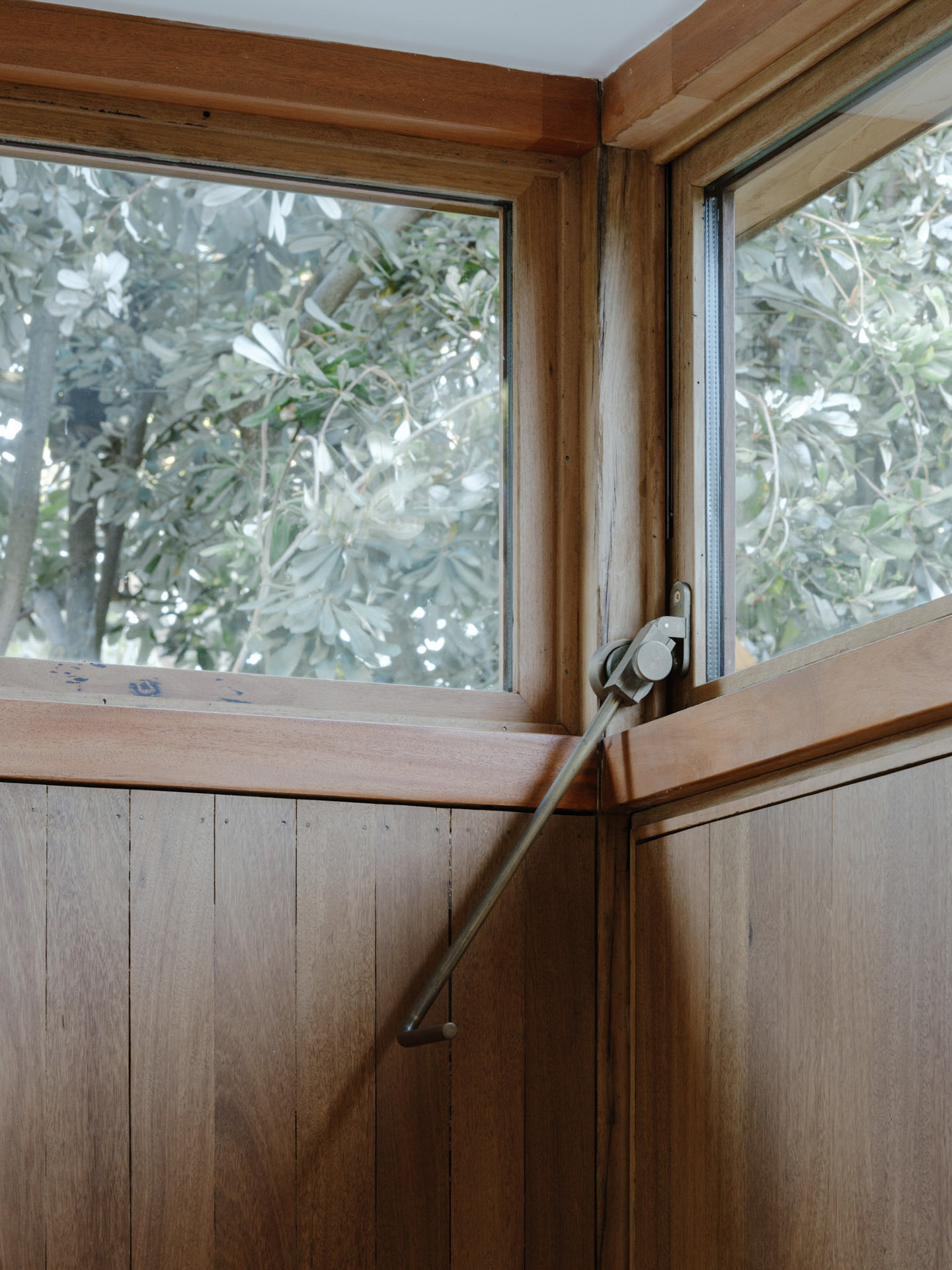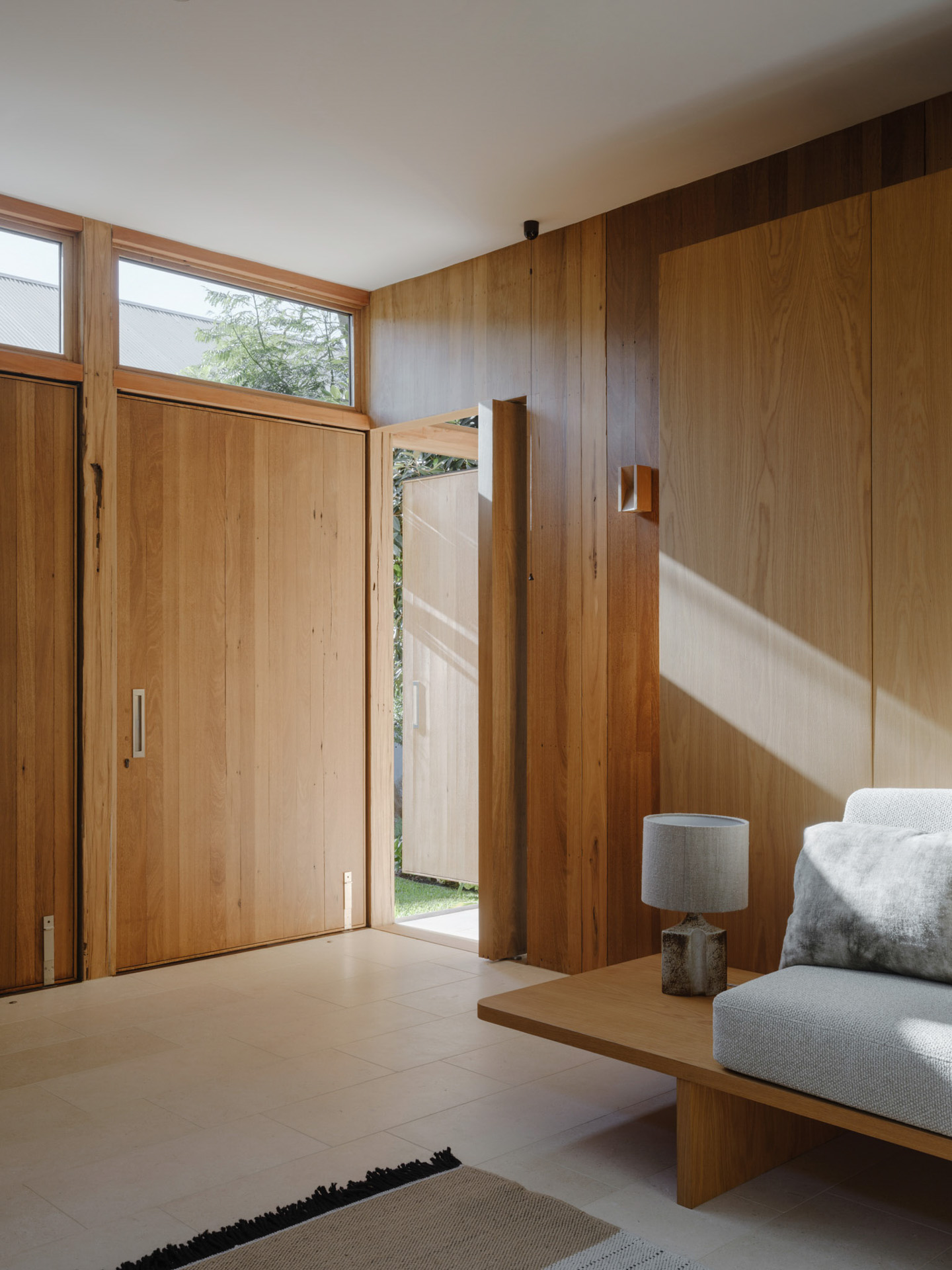 Las puertas sólidas operables permiten ajustar el grado de apertura del edificio. Cerradas, convierten el estudio en un refugio introspectivo; abiertas, conectan el interior con el jardín. Sobre ellas, las aberturas de triforio introducen una luz filtrada que suaviza la atmósfera y refuerza la relación con el exterior.