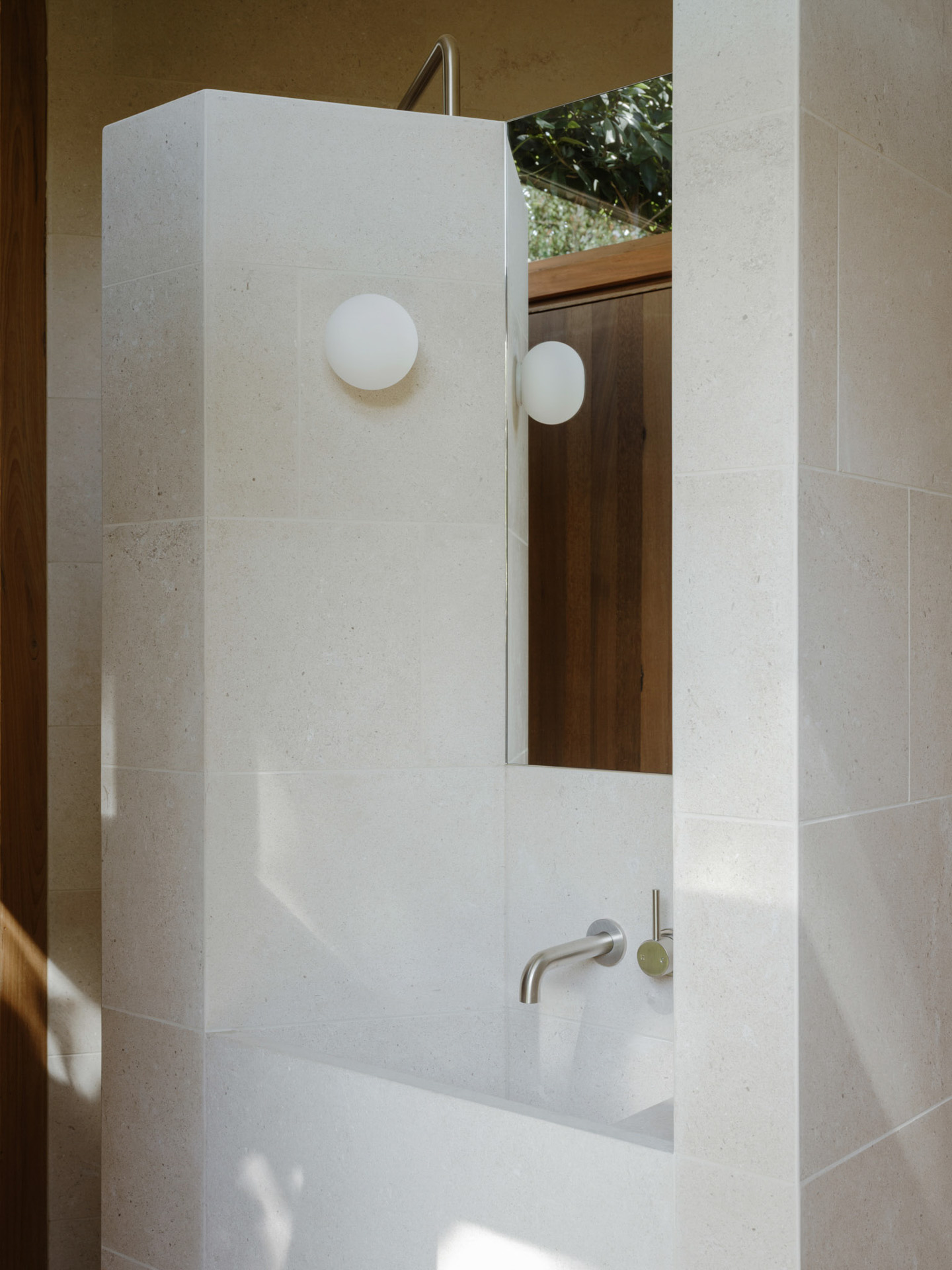 La parcela triangular obligó a abandonar la lógica ortogonal habitual. En lugar de corregir la geometría del terreno, el proyecto la asume como parte del diseño. El baño se sitúa en el vértice más estrecho, resuelto mediante una columna de servicios trapezoidal que concentra instalaciones y define el espacio.