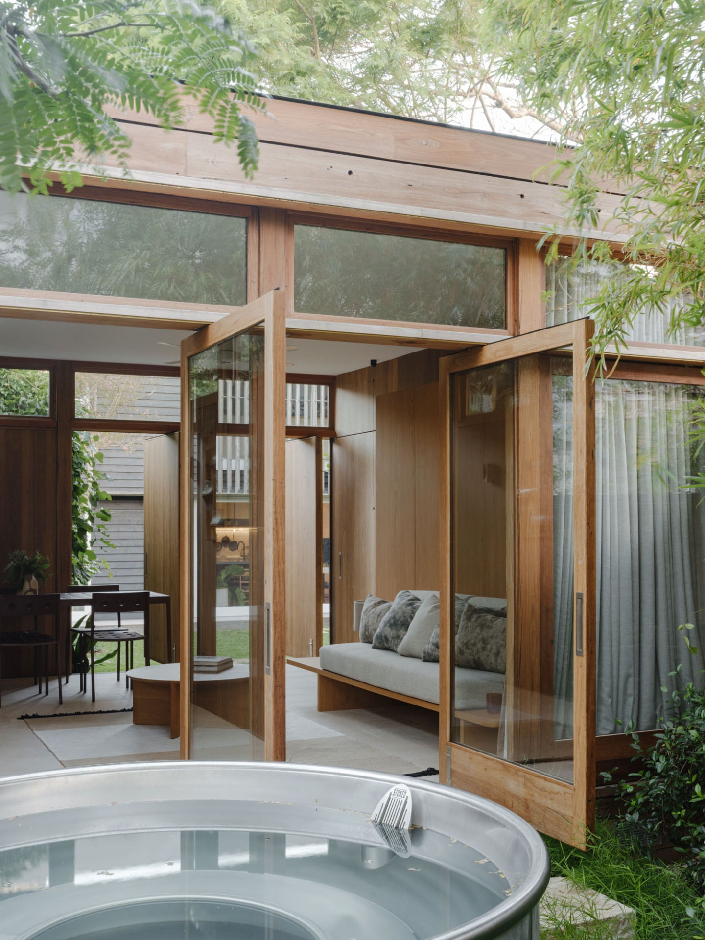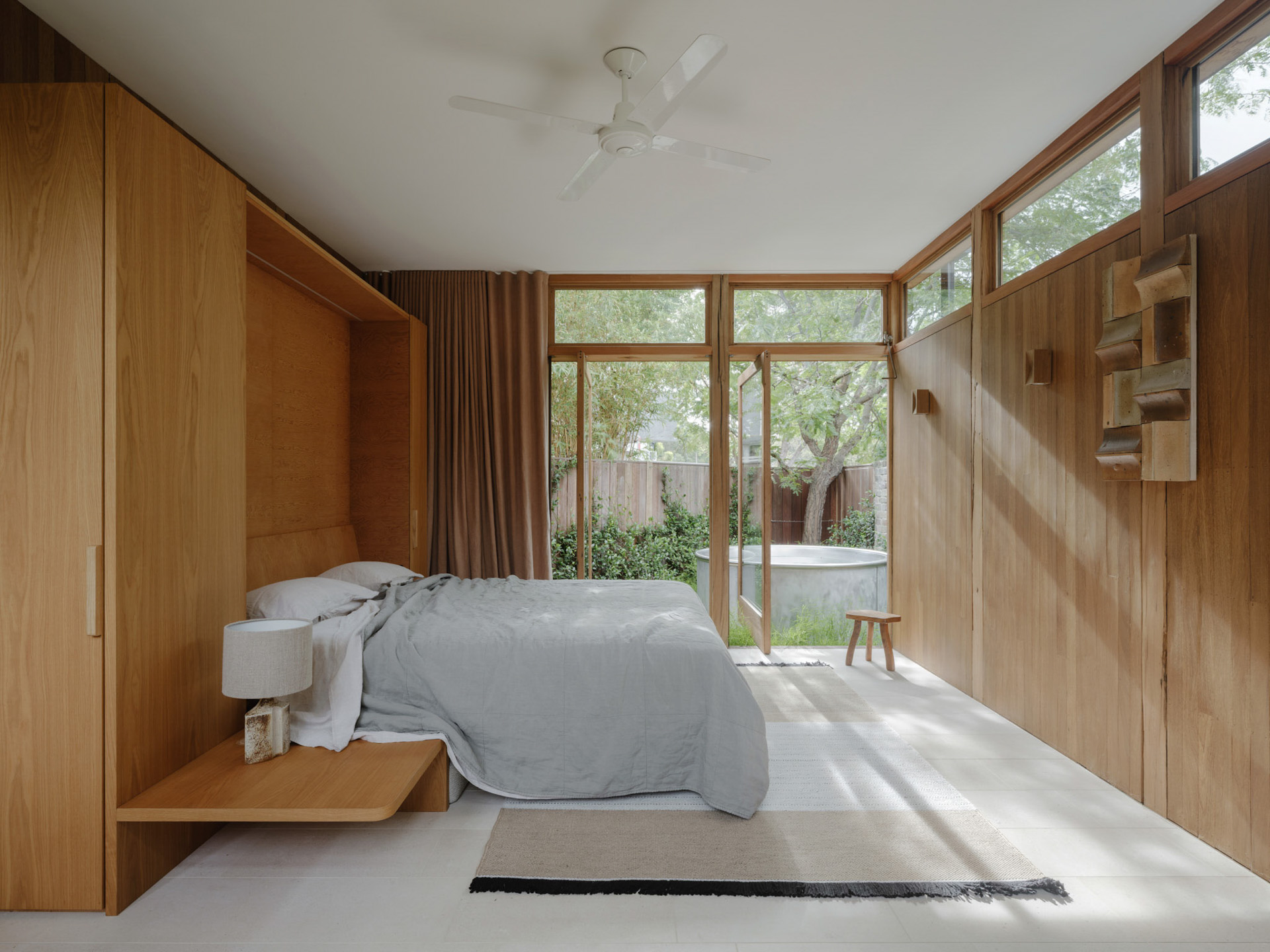 El volumen se apoya discretamente junto a la casa principal, pero mantiene autonomía espacial y funcional. Su programa es deliberadamente abierto: puede funcionar como dormitorio ocasional, sala de estar o espacio de trabajo. Esta flexibilidad responde a una idea sencilla pero cada vez más necesaria en la arquitectura doméstica contemporánea: crear espacios capaces de adaptarse a cambios de uso sin necesidad de ampliaciones constantes. En este sentido, Love Shack se plantea como un estudio multifuncional en jardín capaz de absorber distintas formas de habitar y trabajar.