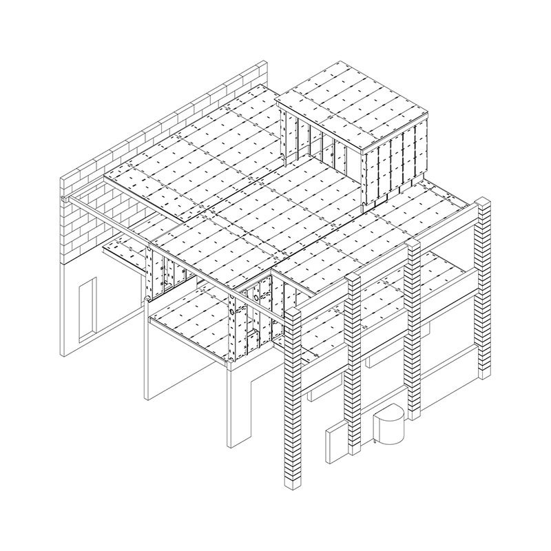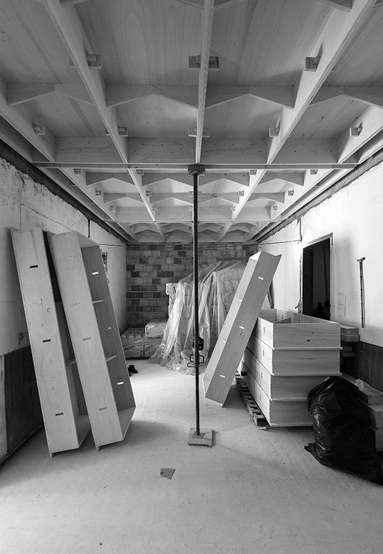El aumento del espacio en vertical requería una solución ligera que no sobrecargase los muros originales de piedra. Así pues, se decidió usar un sistema constructivo que emplea piezas prefabricadas de madera, obtenidas con máquinas de corte por control numérico (CNC).