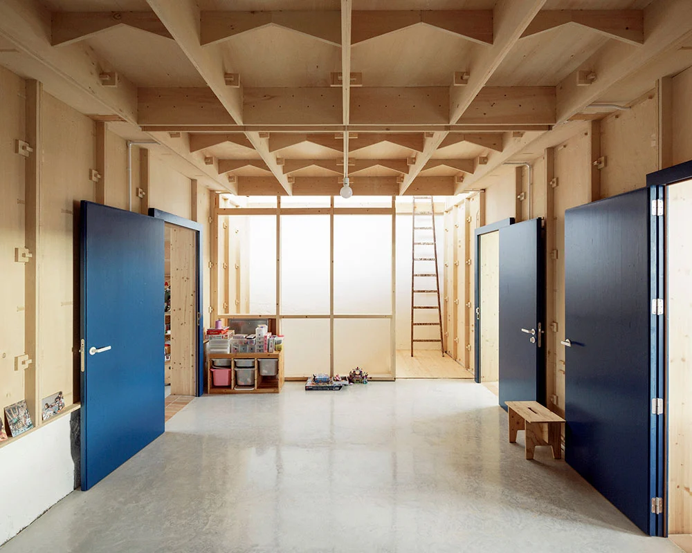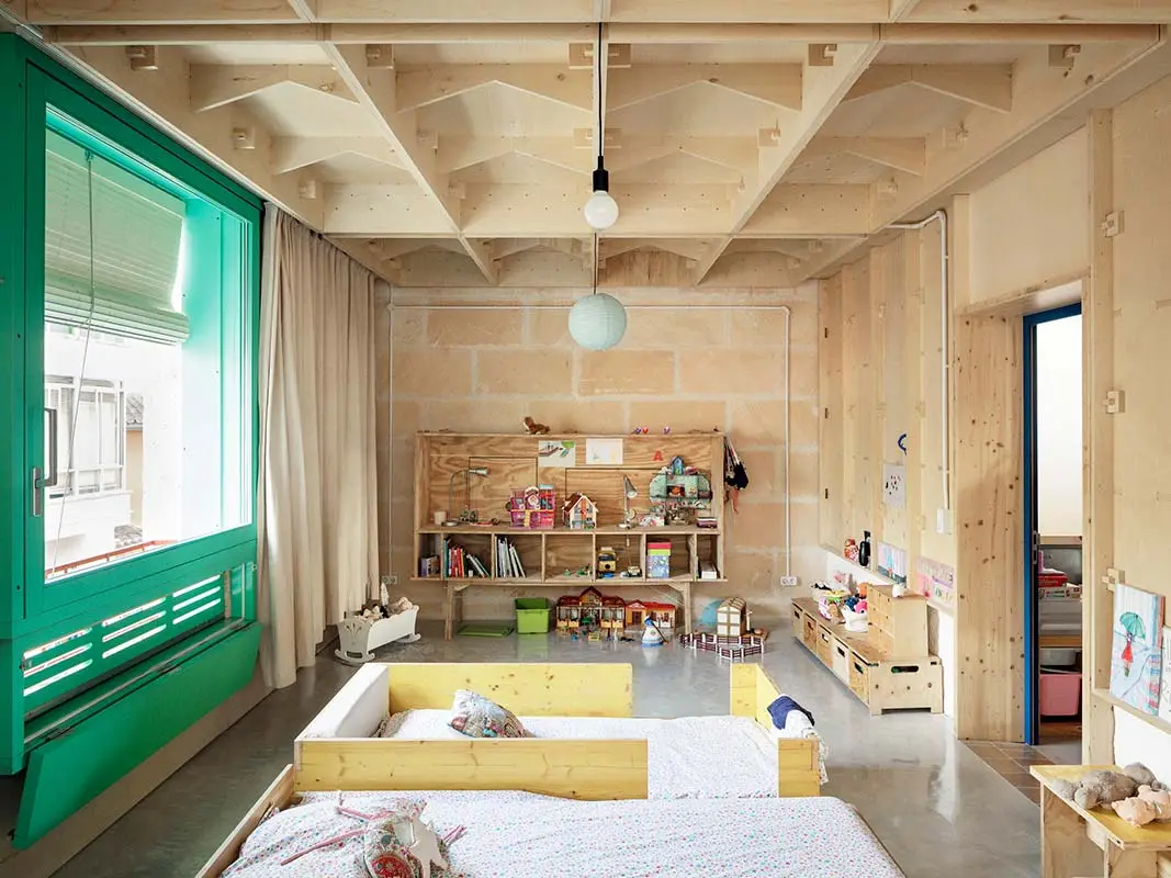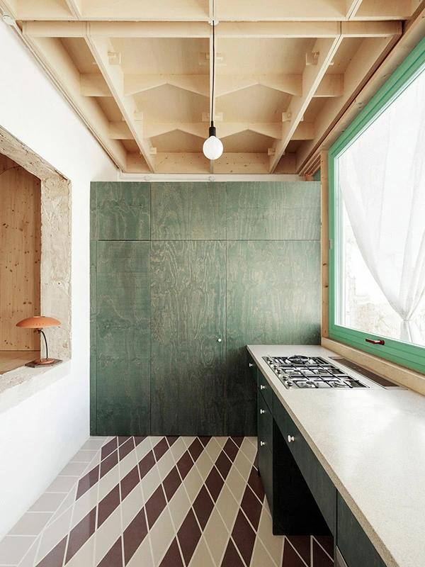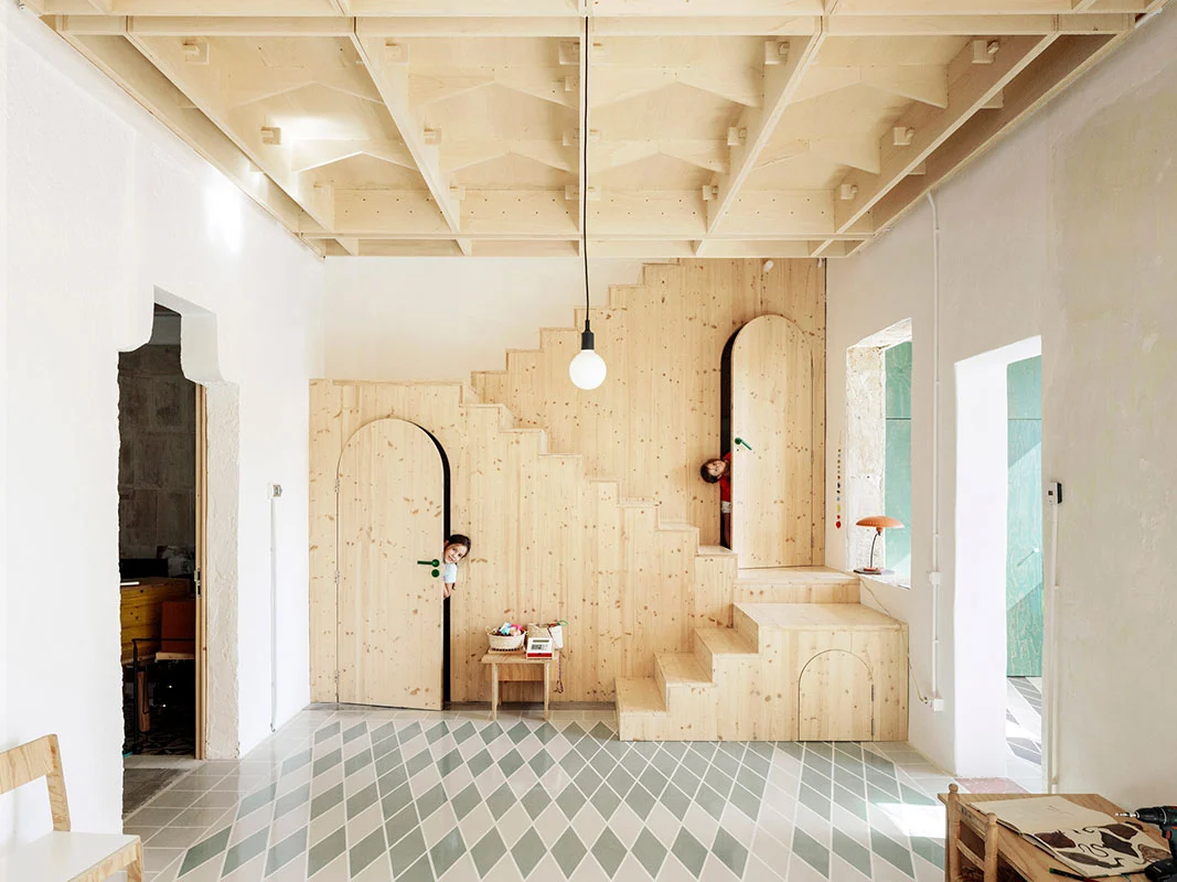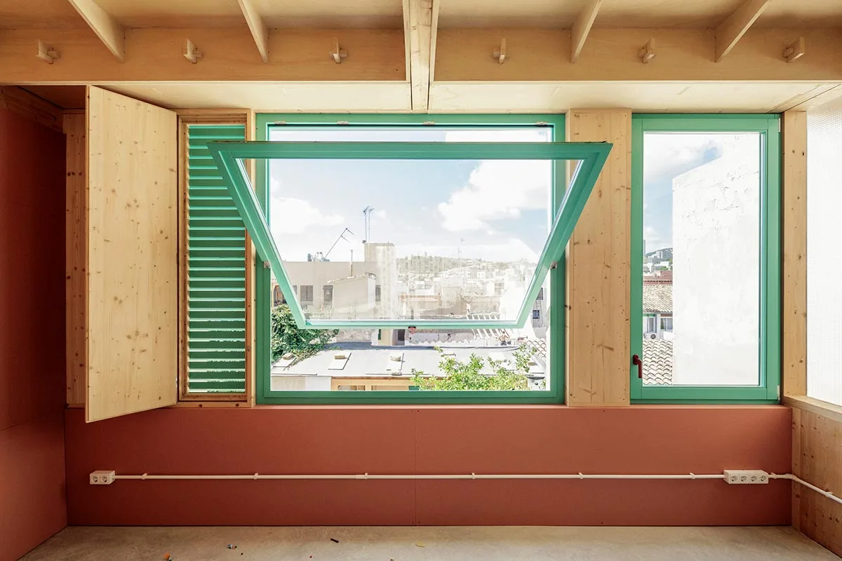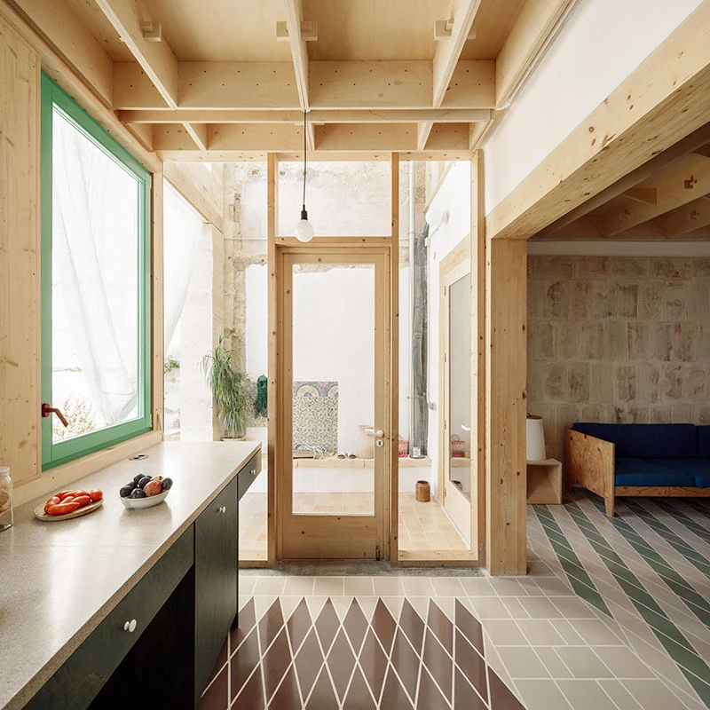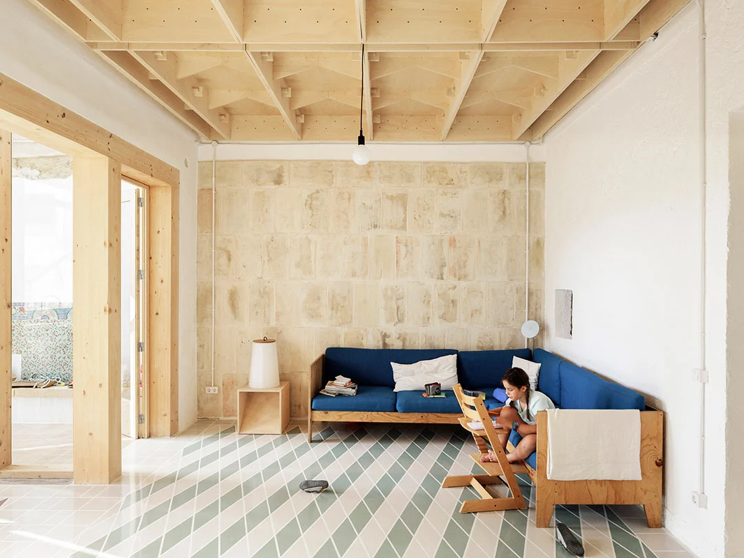 Se partió de un armazón autónomo, realizado a partir de tableros de madera contrachapada de álamo de 244 x 122 cm, que se ancló sobre la base preexistente. La estructura de esos «módulos» se puede leer fácilmente en los techos, ya que se dejaron al descubierto para reducir costes y como un elemento decorativo más. Una particular geometría que recuerda a los artesonados del casco antiguo de Palma y confiere una cadencia espacial a la casa.