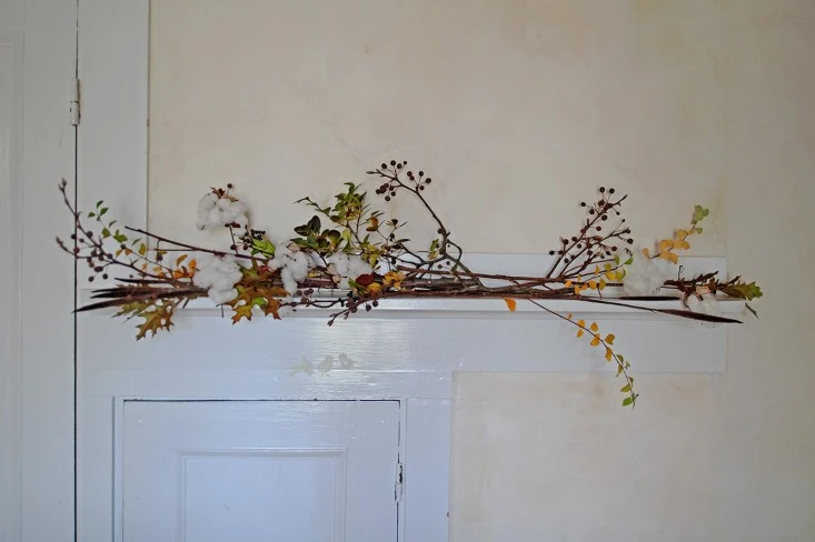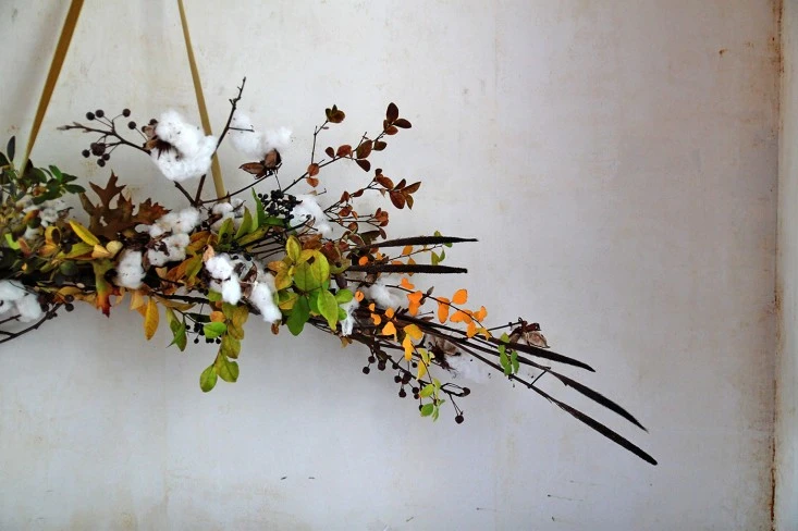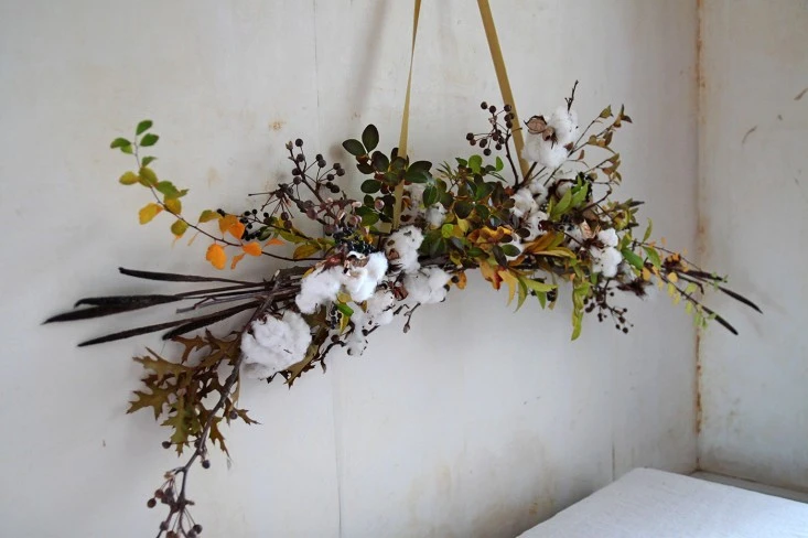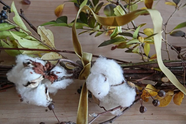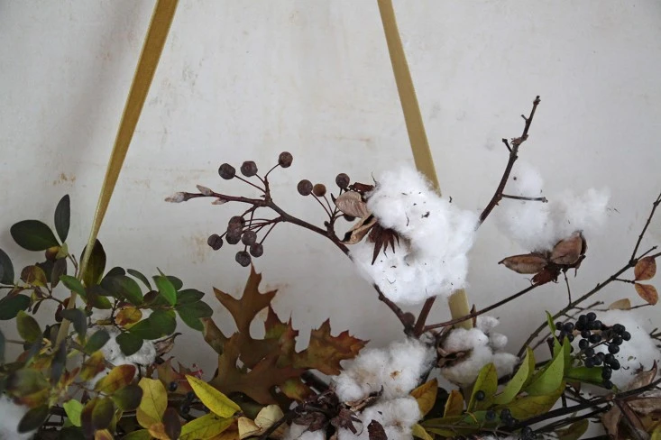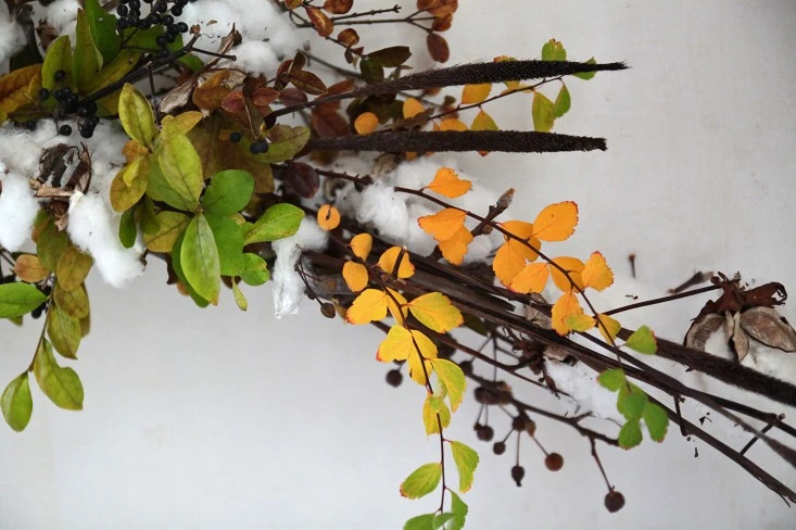 Una vez que tengamos la estructura, empezaremos a desarrollar las capas del arreglo. En este caso, se utilizó algodón en rama, algo poco convencional pero que da el brillo y el contrapunto visual justo a los colores otoñales. Combinado con ramas más pequeñas y hojas recogidas durante una escapada al campo o a un parque cercano, iremos moldeando el diseño en altura con alambre floral.