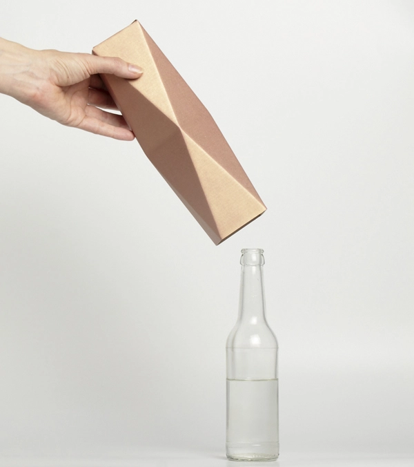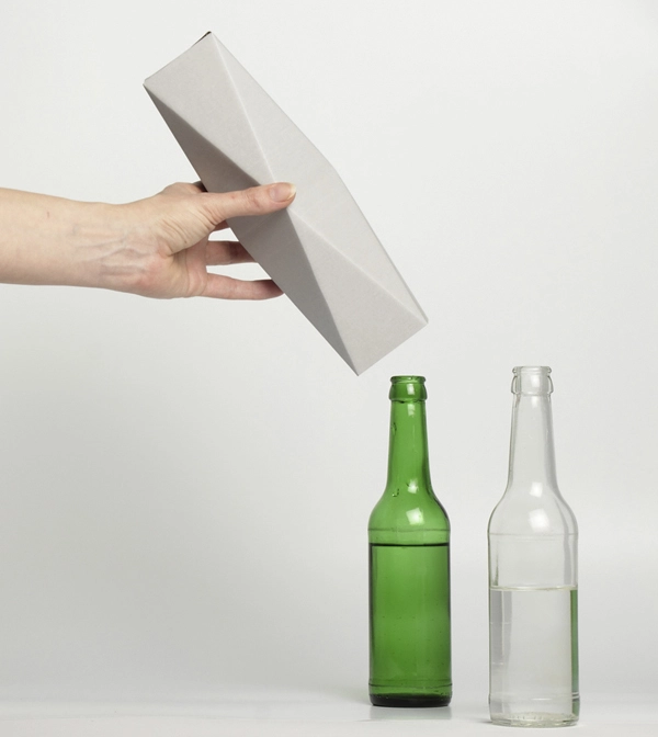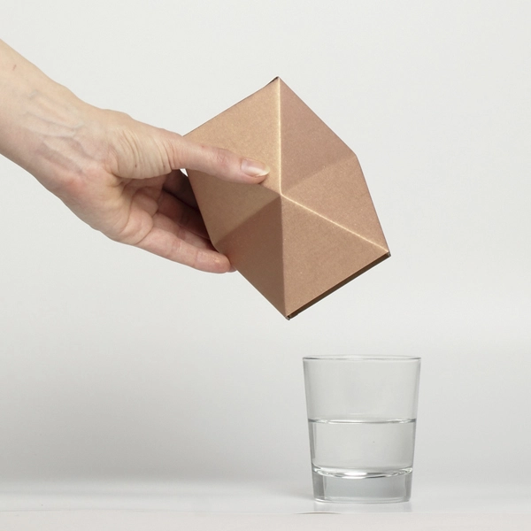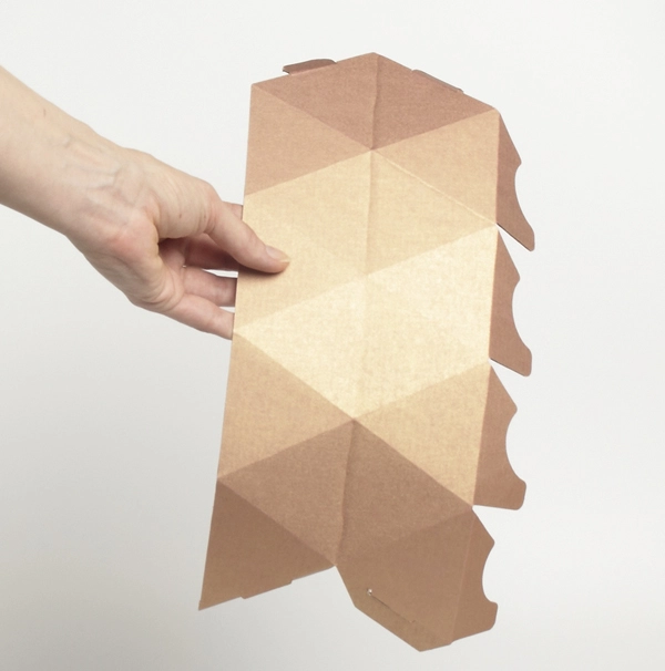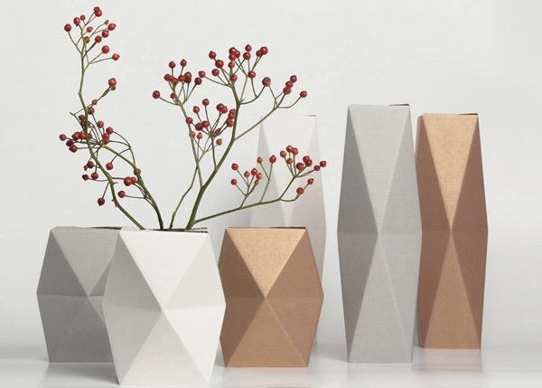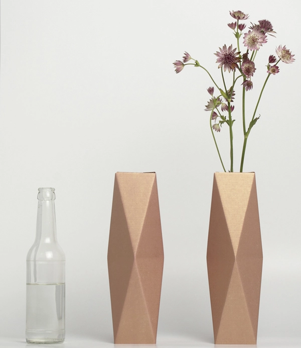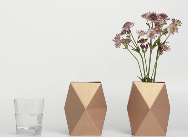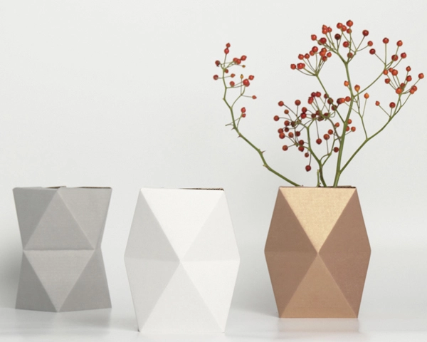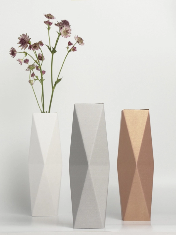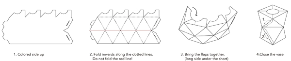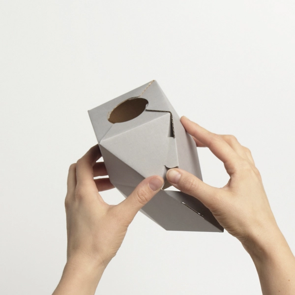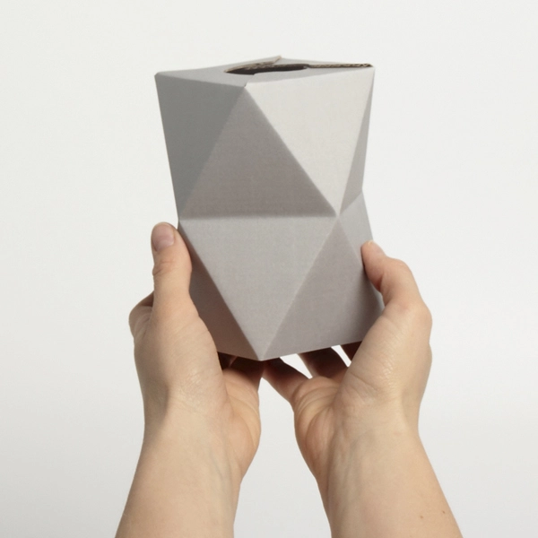 Las láminas de cartón que constituyen el envoltorio del jarrón, se construyen de manera rápida y sencilla. El resultado es un jarrón monocromático (gris, blanco o bronce), caracterizado por su forma poliédrica y casi cristalina.