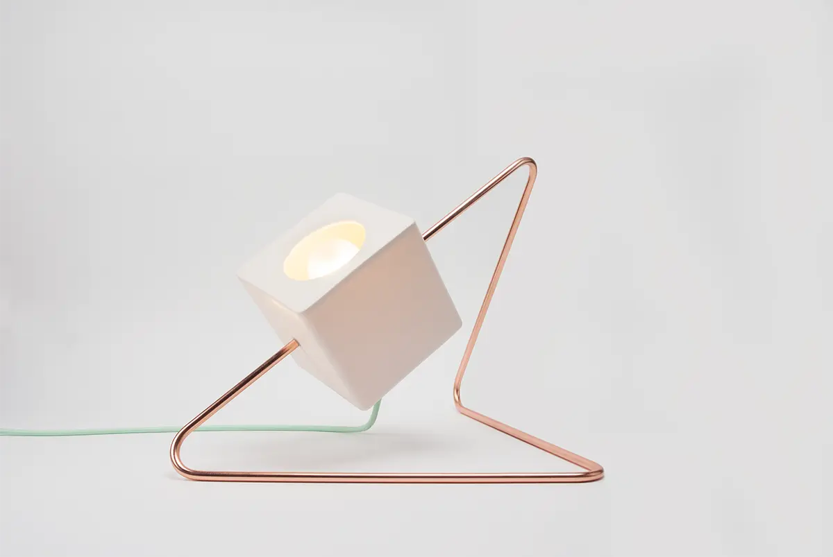 Todas esas características se concentran en su Focal Point, comenzando por la llamativa base triangular en cobre macizo elaborada a partir de una varilla de 10 mm de diámetro. El color, la forma y el brillo de este elemento de sustentación son verdaderos imanes para el ojo. El soporte aloja a media altura un hermoso cubo blanco de porcelana que contiene la fuente de luz, una bombilla LED. La decoración se completa con el cable trenzado en un atípico color verde menta que se ancla a la pantalla mediante un anillo de cobre.