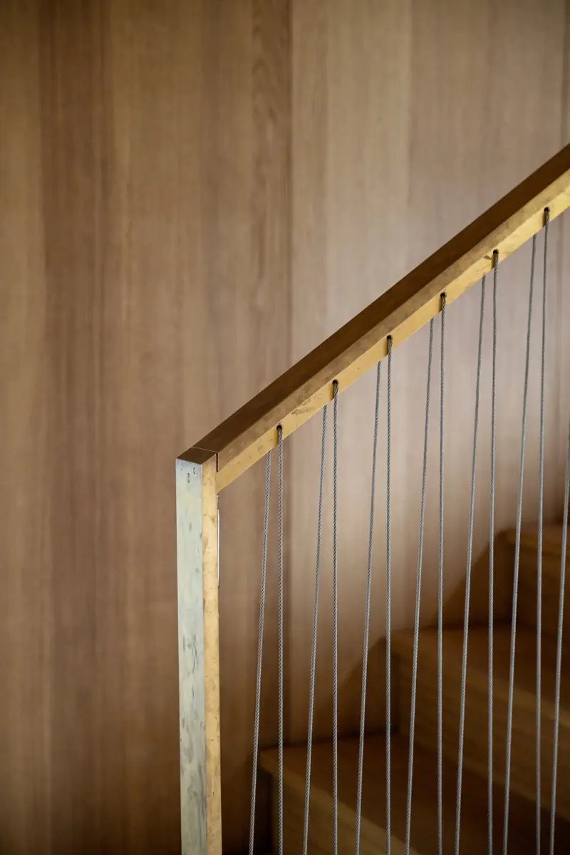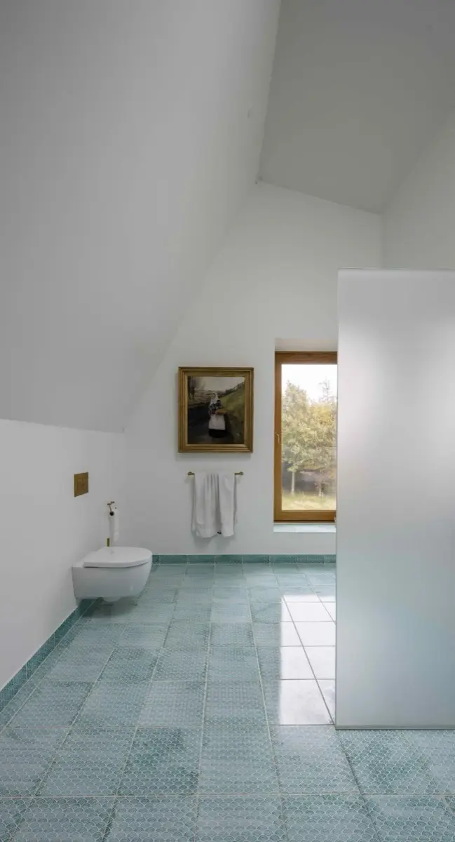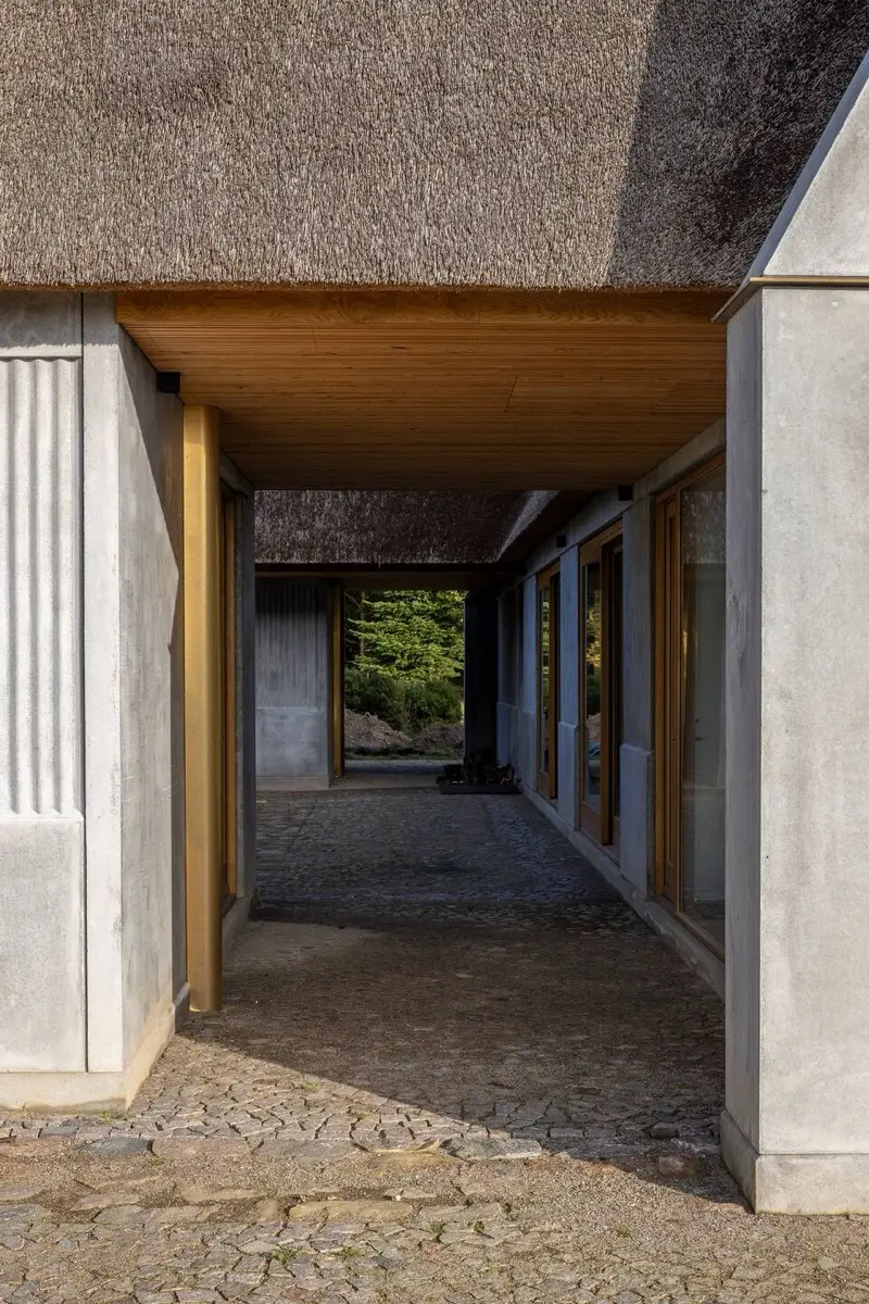 Como un relieve dorado tallado en los paneles de hormigón en bruto, las juntas de latón suavizan el edificio y, como tales, resuenan con la lengua vernácula local. El agua fluye suavemente a través del paisaje, creando un ambiente de tranquilidad y paz.