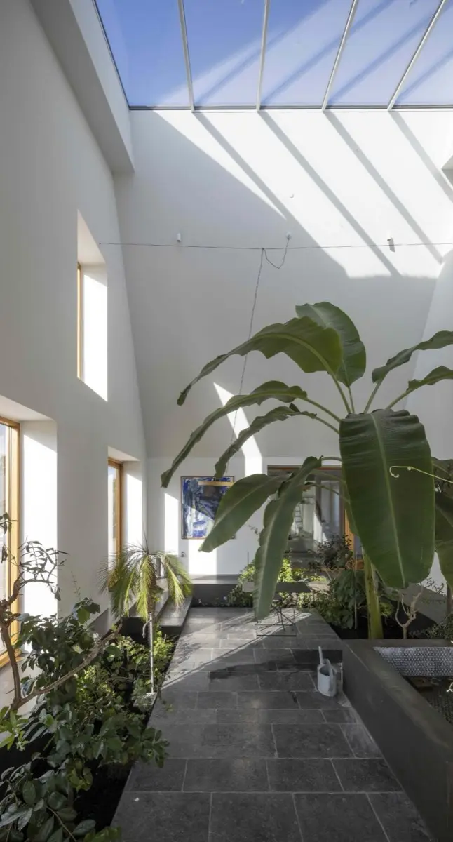 En el interior, la vivienda se despliega con una elegancia minimalista, y llama la atención por el extremo detalle en el detalle constructivo y la combinación de materiales presentados en bruto, sin revestimiento: hormigón pulido, paneles prefabricados, medra local, piedra…